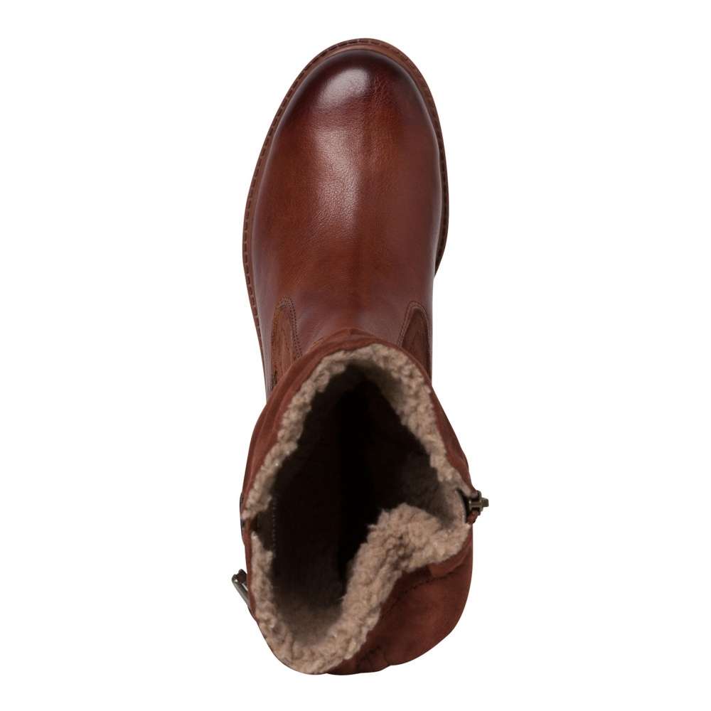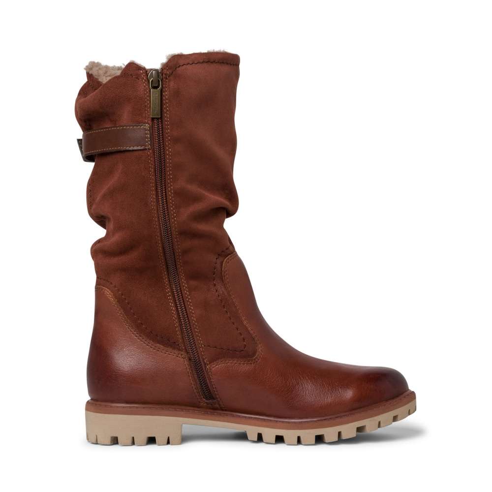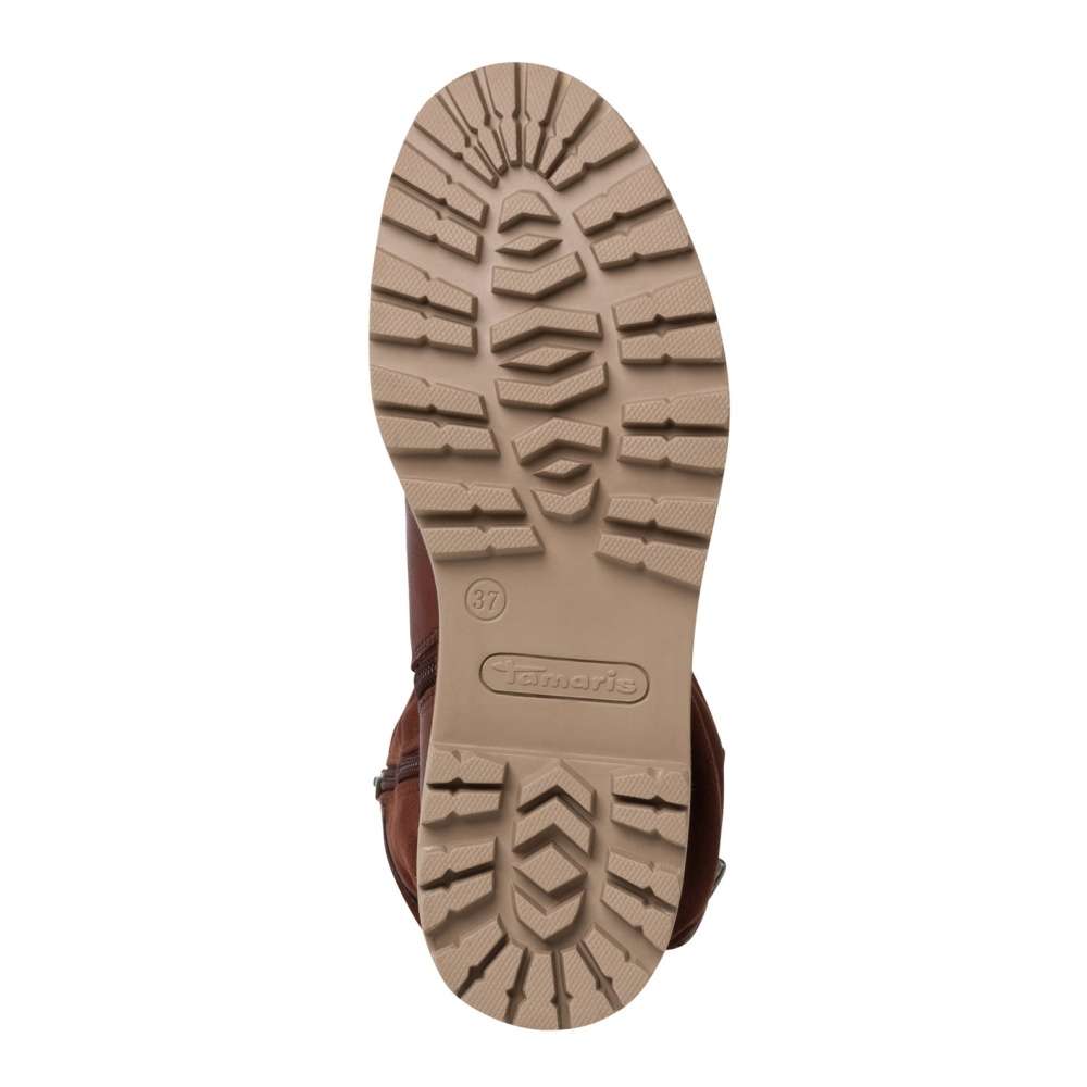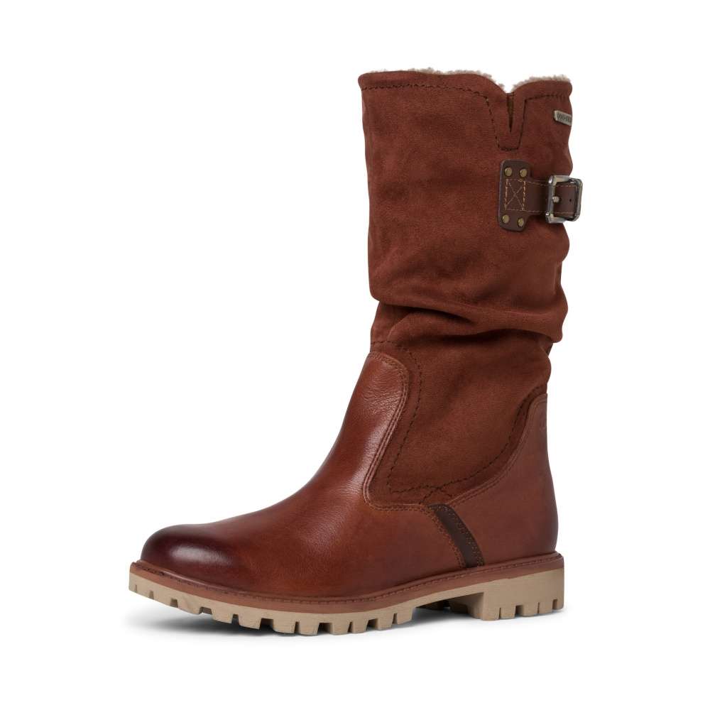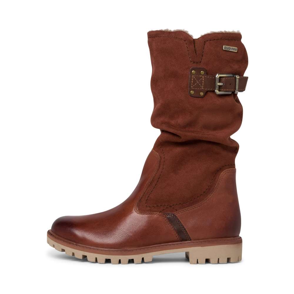 Dámské sportovní kozačky značky TAMARIS, které jsou zdobené kontrastním lemováním podešve a na vnější straně páskem s přezkou pro zvětšení objemu kolem lýtka. Mají kulatou špičku, ve spodní části hladký povrch, teplou podšívku a na vnitřní straně funkční zip pro snadné obutí. Tento model oceníte při větších mrazících na cestě do práce, ale i na procházce s pejskem.