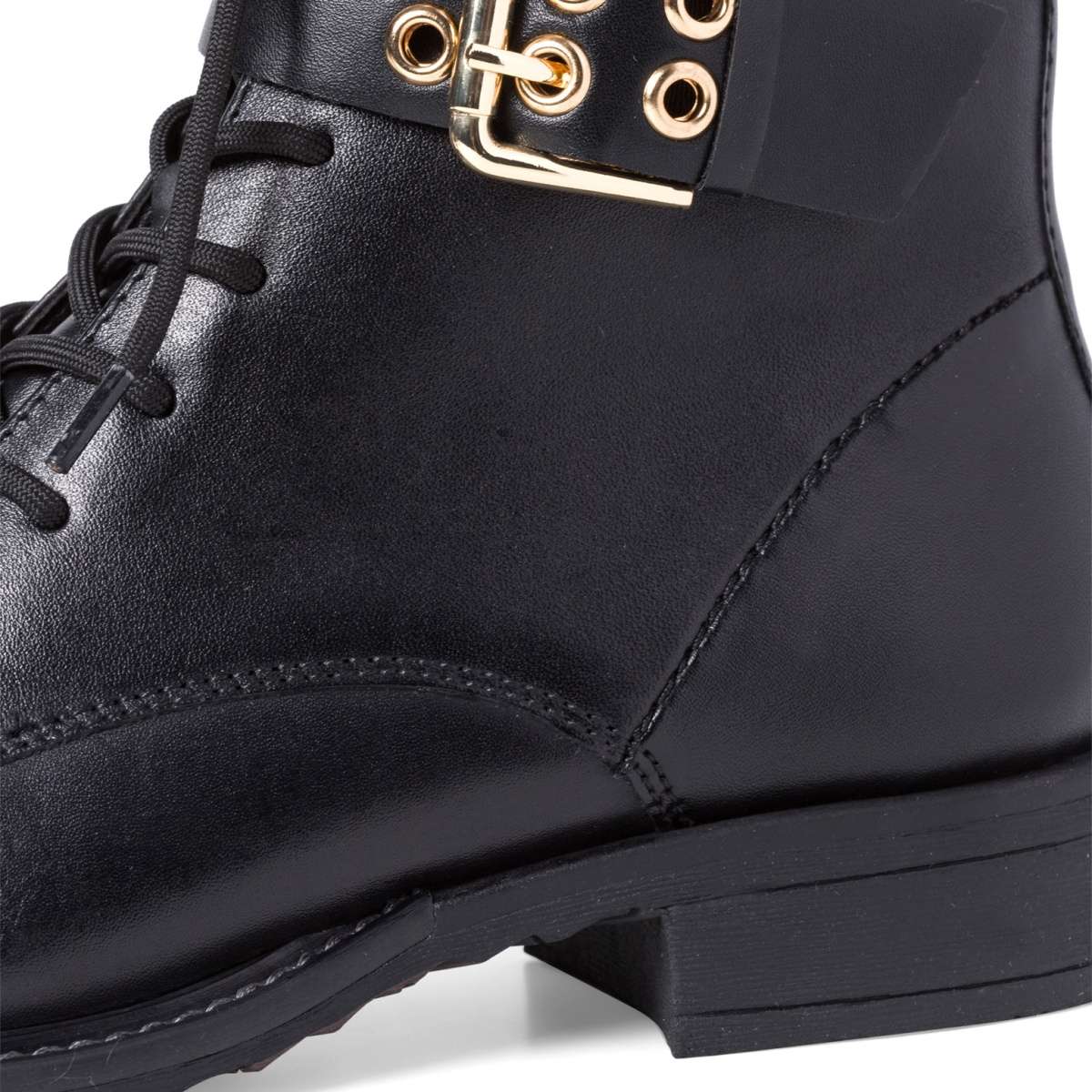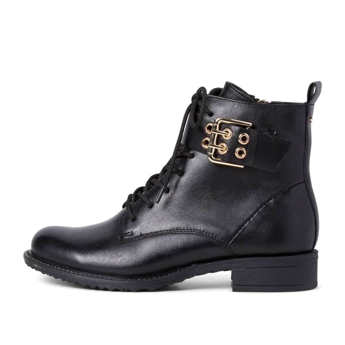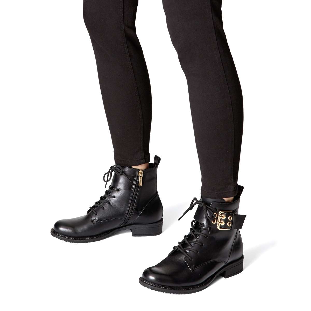Hladký svršek zdobný výraznou zlatou sponou na pásku kolem kotníku, je vyroben z pravé kůže. O snadné nazouvání se postarají funkční zip, šněrování tkaničkami a poutko v zadní části obuvi.