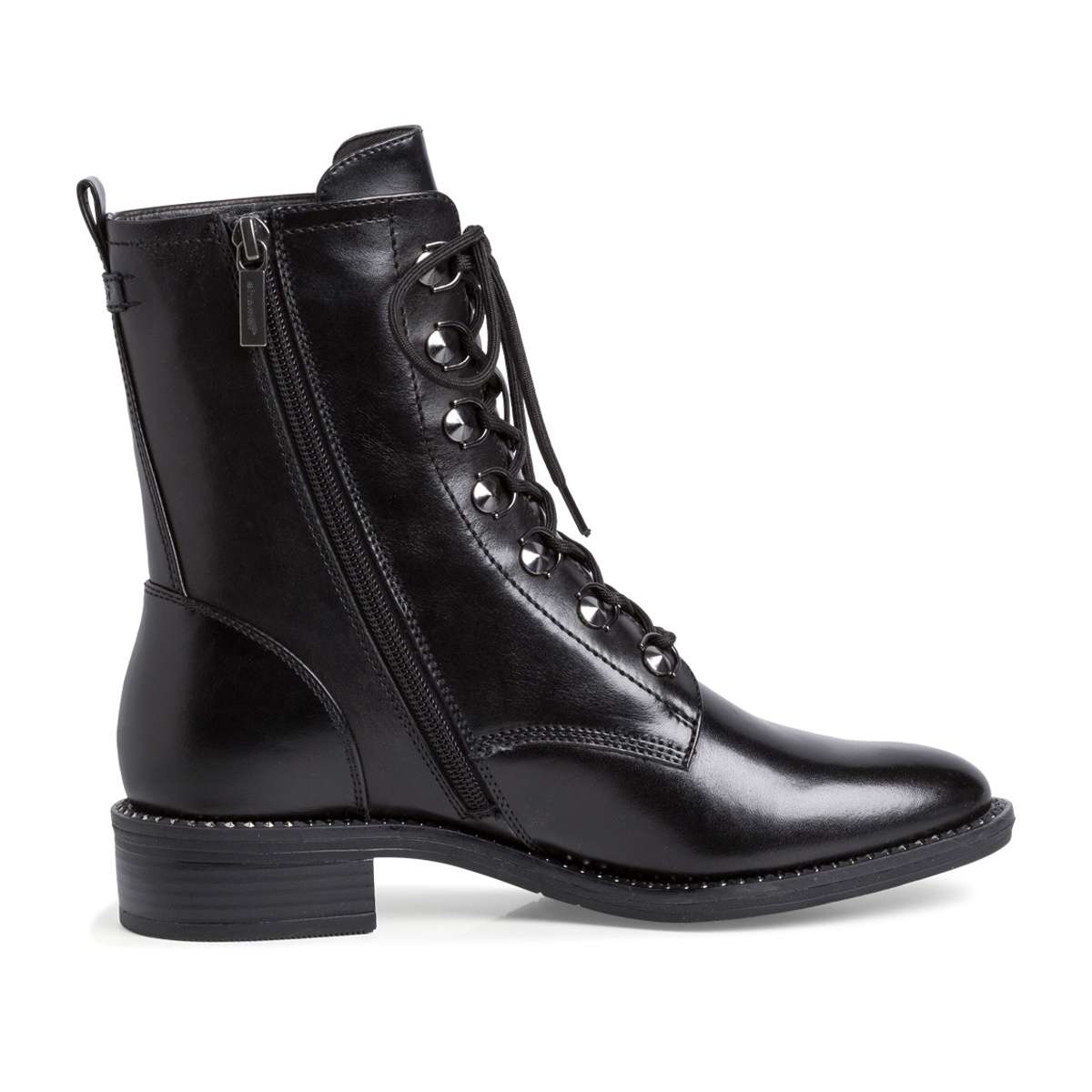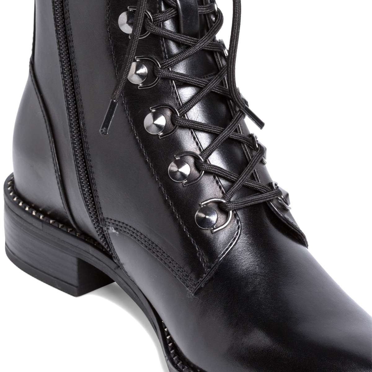 Hladký jemně prošívaný svršek je ozvláštněn kovovými cvočky na nártu, které botám dodají ten správný šmrnc. Mají šněrování tkaničkami pro úpravu boty přímo k Vaší noze a na vnitřní straně zip pro jednodušší obutí.