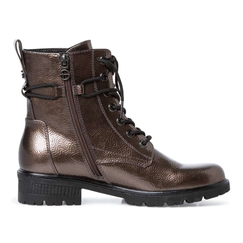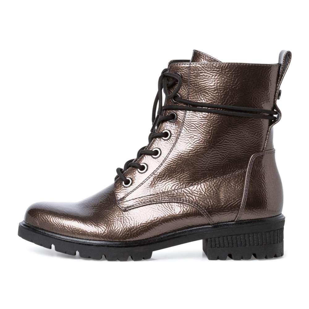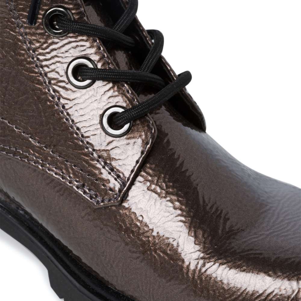 Lesklý jemně prošívaný svršek je v oblasti nártu doplněn šněrováním zajímavě propletenými tkaničkami, které společně s funkčním zipem usnadní nazouvání obuvi.