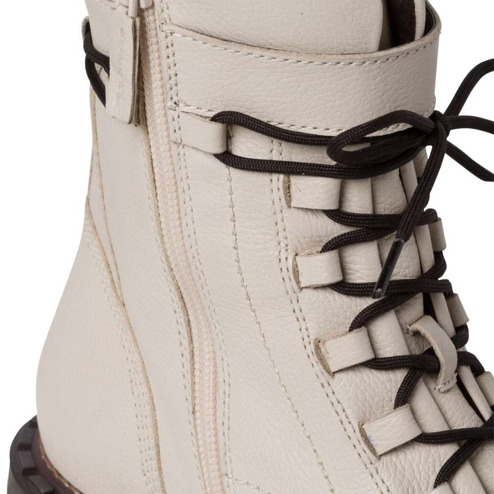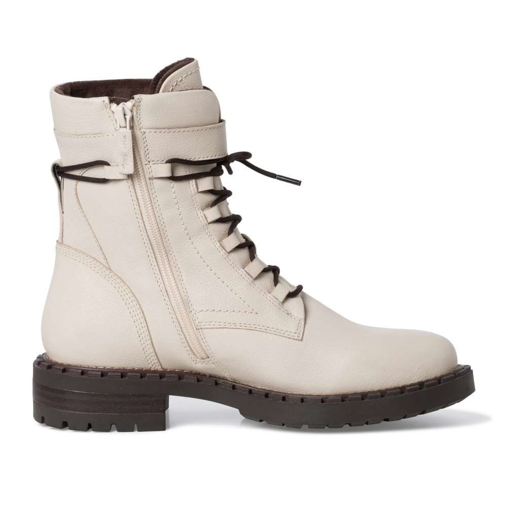 Jemně strukturovaný svršek je zdobný výrazným prošíváním, páskem s kovovou přezkou v horní části obuvi a zajímavě propleteným šněrováním, které společně s funkčním zipem zajistí snadné nazouvání.