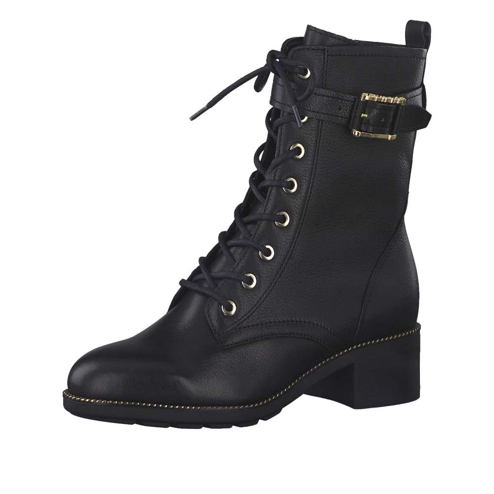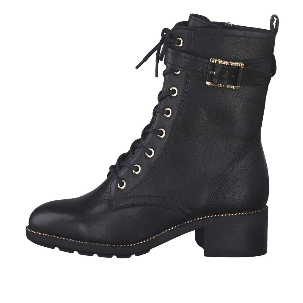 Detailní informace Nádherný model od značky TAMARIS s pozlacenými detaily v podobě přezky a drobných kovových prvků v části podešve. Svrchní materiál je vyroben z pravé přírodní usně a je decentně prošitý. Funkční zip na vnitřní straně skvěle usnadní obutí a tkaničkami na šněrování si boty můžete upravit přesně podle Vašich představ. S měkkou stélkou a s vroubkovanou podešví se můžete těšit na pohodlnou a komfortní chůzi po celý den nošení. Obuv, která by rozhodně neměla chybět ve Vašem botníku.