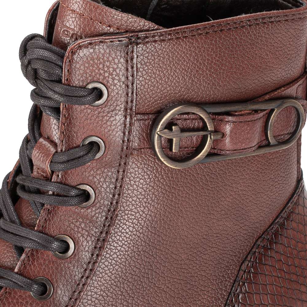 Vzhled této kotníkové obuvi značky TAMARIS Vás zaujme na první pohled. Hladký svršek je zdobný jemným prošíváním, páskem s designovou kovovou přezkou a šněrováním s dvojenými tkaničkami, které společně s funkčním zipem zajistí snadné nazouvání. Komfort na každém kroku Vám garantuje měkká stélka, teplejší podšívka a vyšší podešev doladí celkový vzhled obuvi k dokonalosti. Tento model skvěle doplní Vaše outfity, ať už se vydáte kamkoliv.
