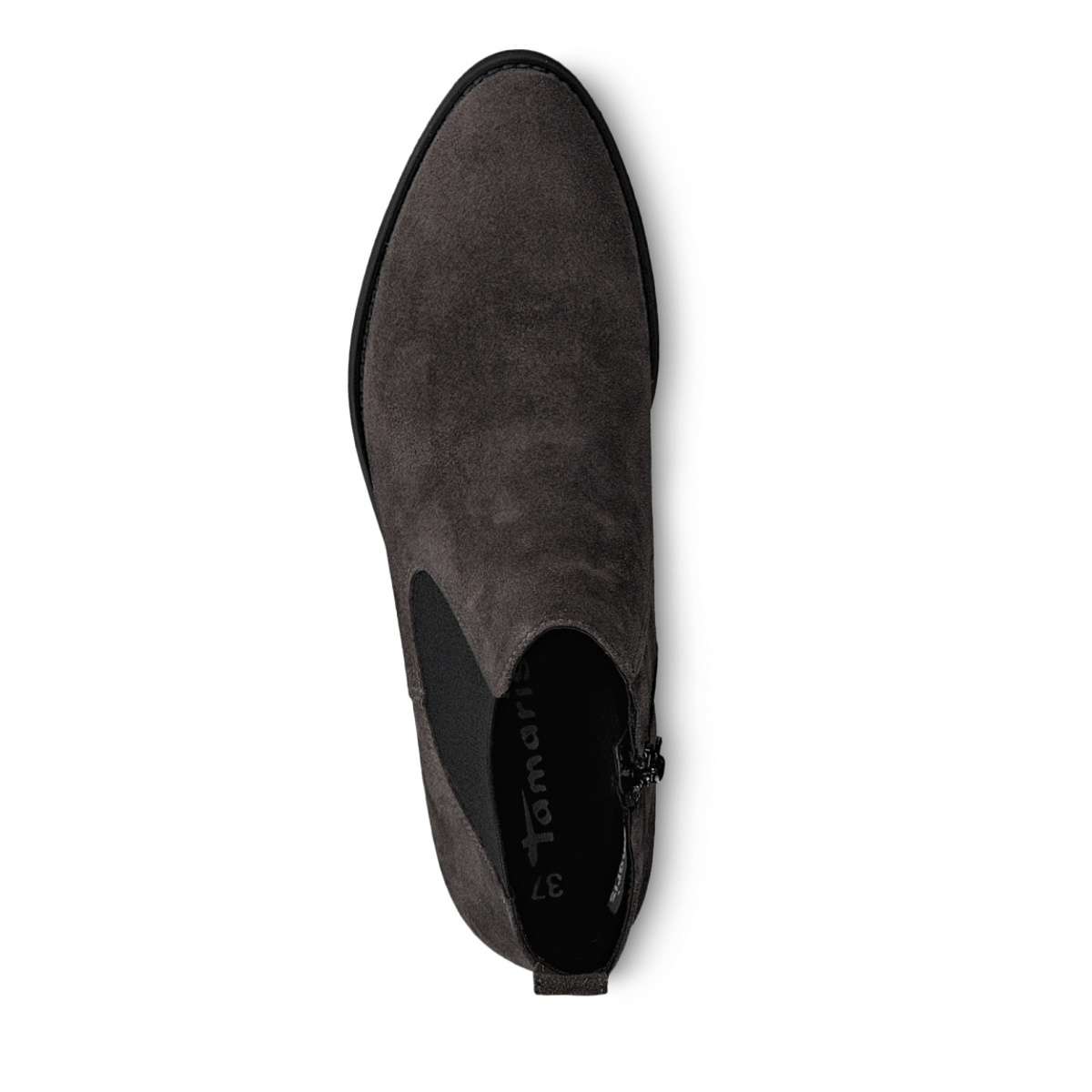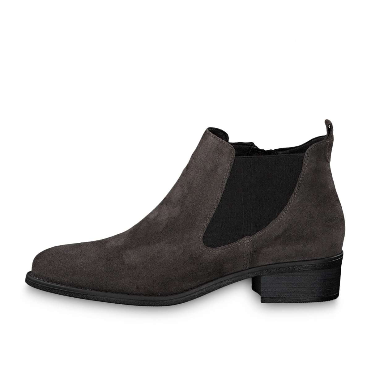 Dámská kotníková obuv TAMARIS se semišovým povrchem z pravé kůže v tmavě šedém provedení, jistě potěší každou moderní ženu. Pro snadné obutí je na vnitřní straně funkční zip a po boku pružná vsazená guma. Můžete je skombinovat se sukní nebo kalhotami a stále budou vypadat úžasně.