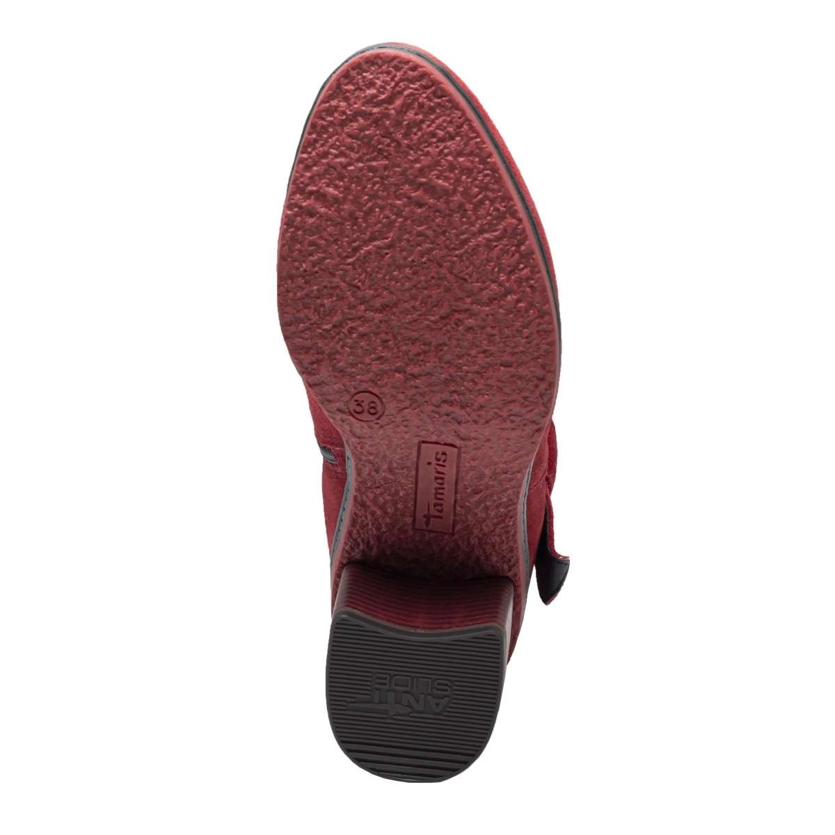 Nádherná dámská obuv v kotníkovém stylu od značky TAMARIS Vás zaujme svým semišovým povrchem a zdobnou mašlí kolem kotníku v červené barvě. Pro snadné obutí je na vnitřní straně použit funkční zip. S tímto elegantním modelem se za Vámi bude každý otáčet.