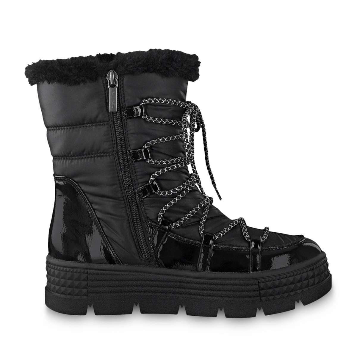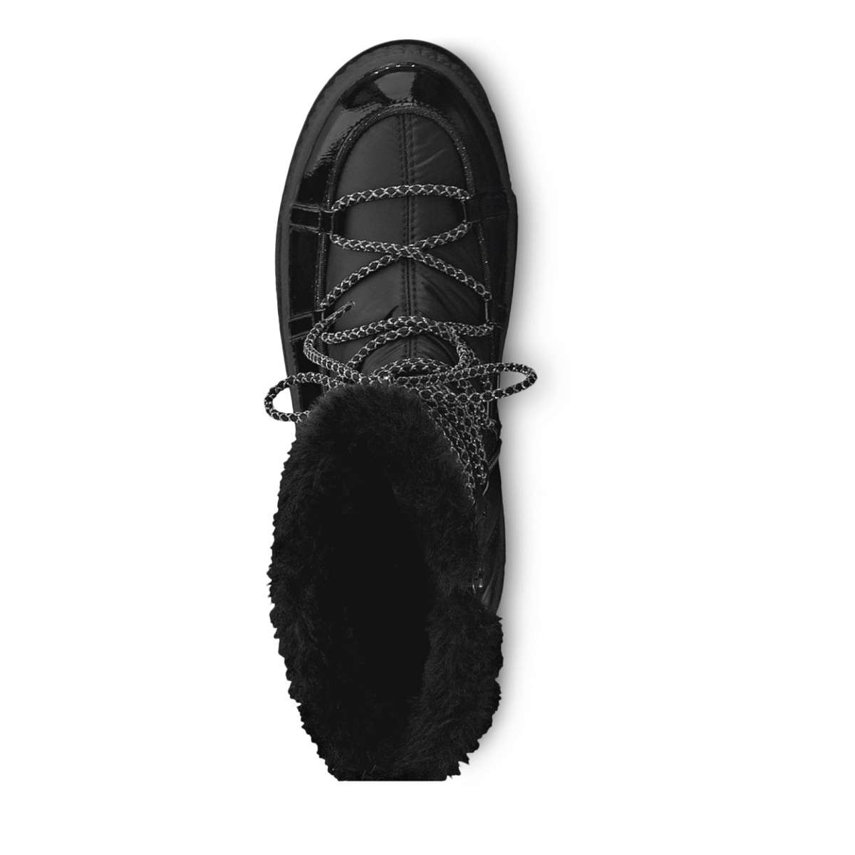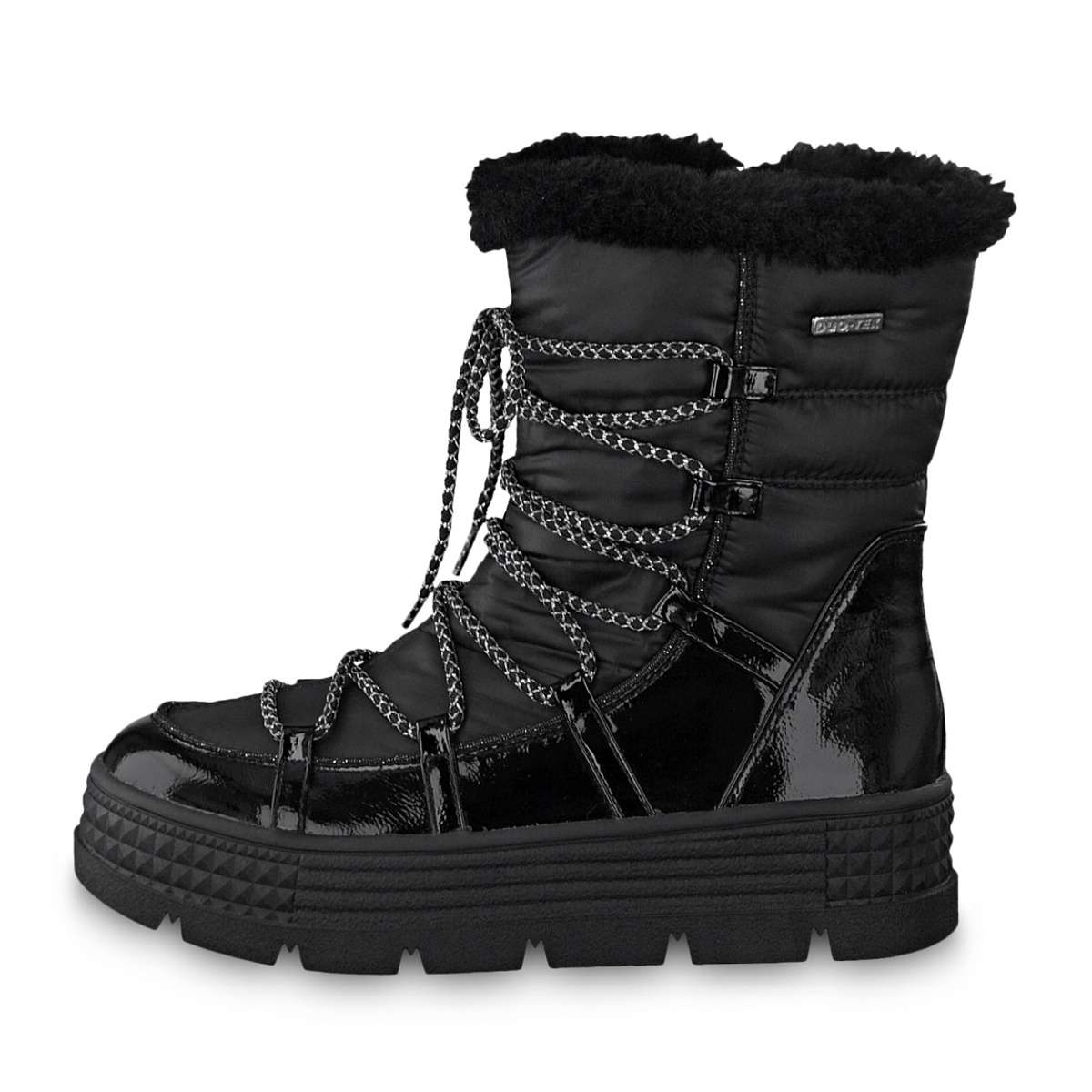 Tyto sněhule černé barvy s lakovaným povrchem ve spodní části od značky Tamaris si už na první pohled zamilujete, díky vysoké podešvi a potaženému kožichu v podšívce, který se Vás příjemně zahřeje. Je také obohacena membránou DuoTex, která je nepromokavá a přesto prodyšná. Obouvání Vám usnadní funkční zip z vnitřní strany a šněrování. Tento kousek bude jistě tou správnou volbou pro pořádné zimní radovánky.