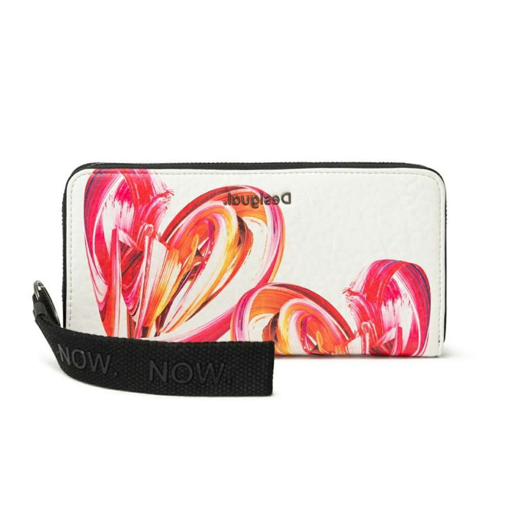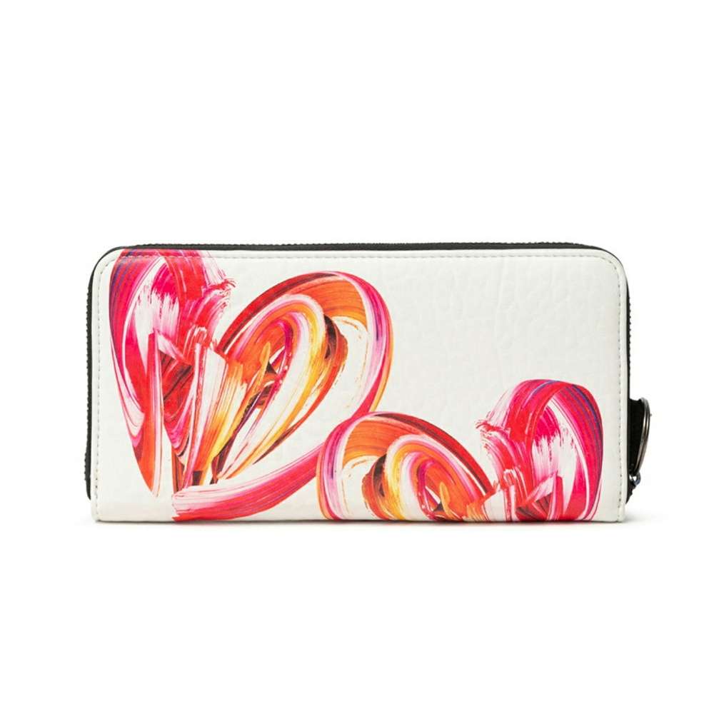 Dámská peněženka se zajímavou malbou a decentním kovovým logem značky Desigual na přední straně. Svrchní materiál je vyroben z bílého oblázkového materiálu a ozvláštněn barevnými detaily.