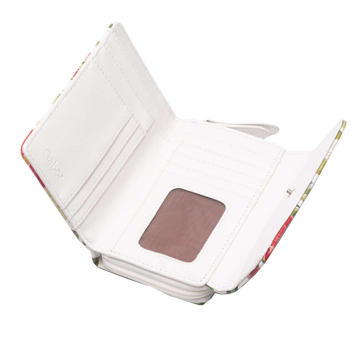 Nadčasový model se vzorem květů je přesně tím pravým, co vystihuje tuto nádhernou GABOR peněženku. Svrchní materiál je pestrobarevný a je jemně prošit, kde doplňujícím prvkem je malé logo značky GABOR. K zapínání slouží cvoček, kdy po jeho rozepnutí uvnitř najdeme praktické kapsičky na karty a v zadní části má zip na drobáky. Tato peněženka bude skvělým doplňkem ke kabelce GABOR v naší kolekci.