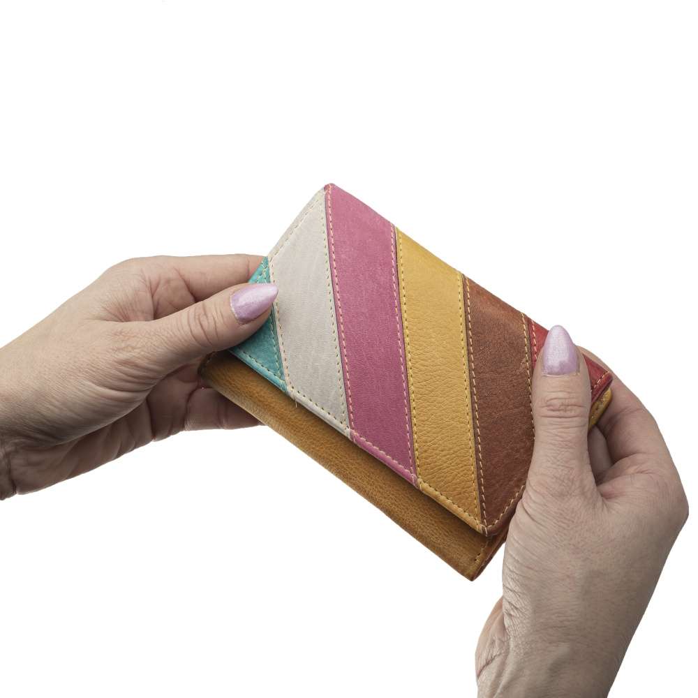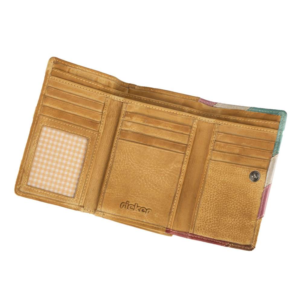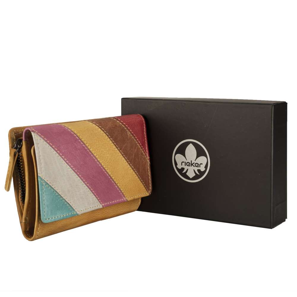 Pestrá dámská peněženka s barevnými pruhy a drobným vtlačeným logem značky RIEKER na zadní straně. Svrchní materiál je vyroben z pravé přírodní usně a dozdoben decentním prošitím. Peněženka je rozdělena na dvě části. Část uzavíratelná cvočkem má spoustu kapsiček na karty, kapsičku s folií na fotky, tři postranní skryté kapsy a dvě podlouhlé na papírové peníze. Kapsa uzavíratelná zipem je rozdělena na dvě části a vhodná například na drobné peníze. Tento model střední velikosti bude krásným doplňkem každé stylové dámy. Rozměry: cca v 9 cm x š 14 cm x h 4 cm