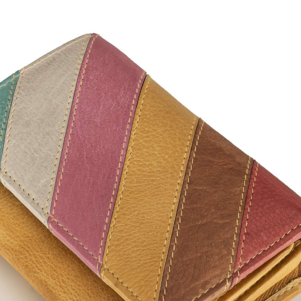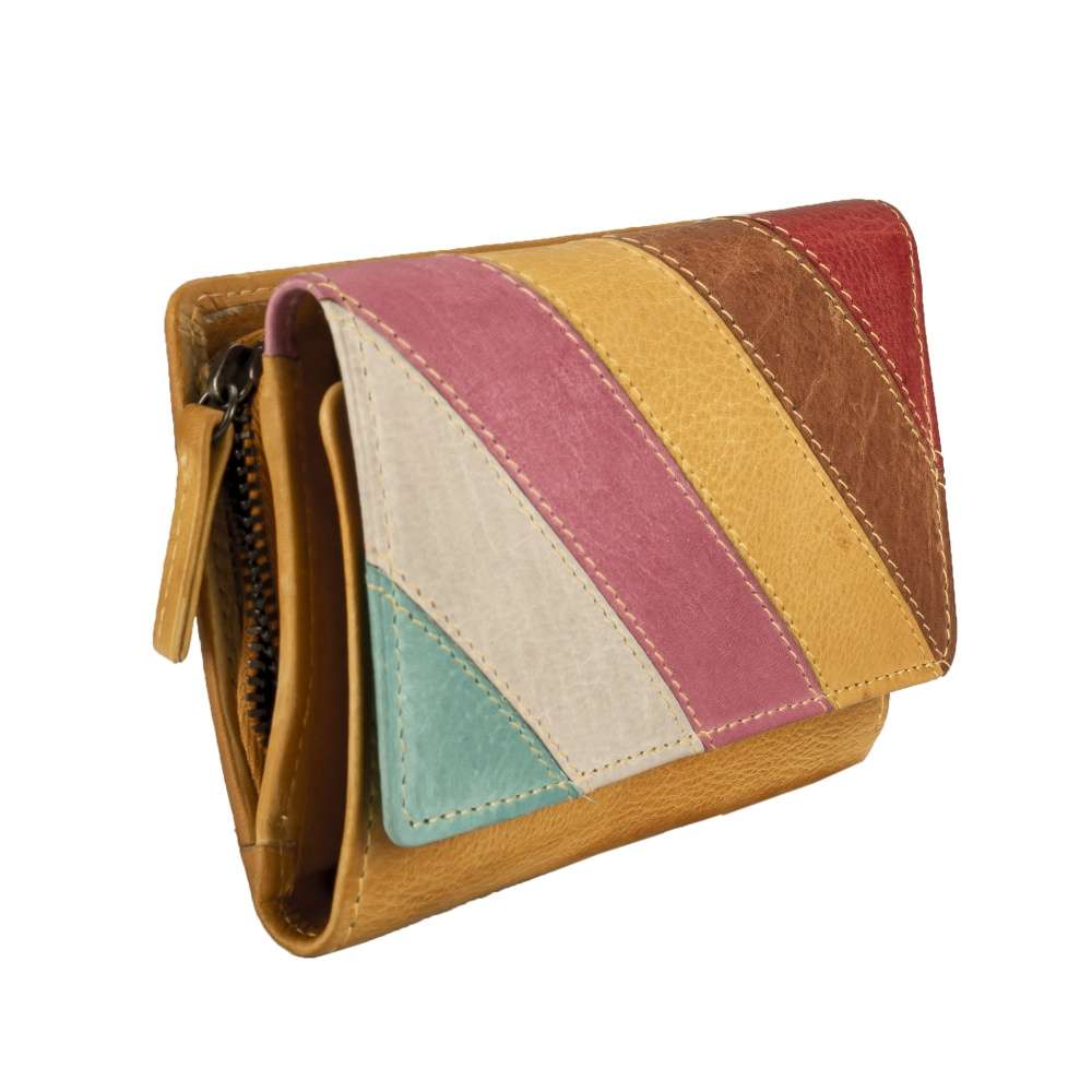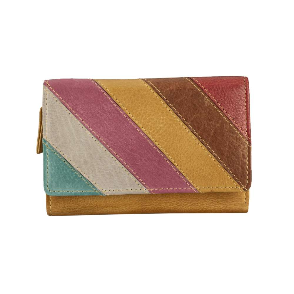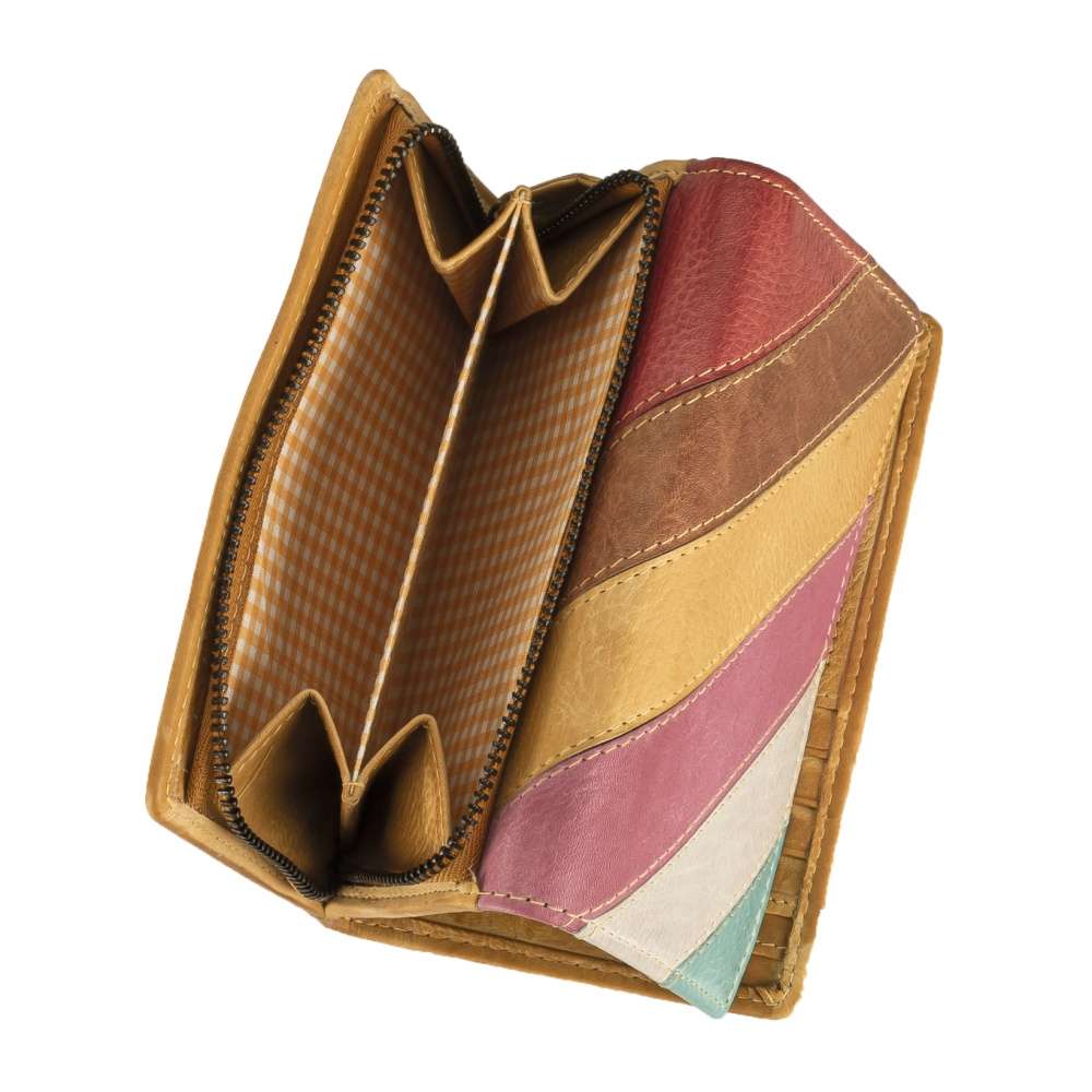 Pestrá dámská peněženka s barevnými pruhy a drobným vtlačeným logem značky RIEKER na zadní straně. Svrchní materiál je vyroben z pravé přírodní usně a dozdoben decentním prošitím. Peněženka je rozdělena na dvě části. Část uzavíratelná cvočkem má spoustu kapsiček na karty, kapsičku s folií na fotky, tři postranní skryté kapsy a dvě podlouhlé na papírové peníze. Kapsa uzavíratelná zipem je rozdělena na dvě části a vhodná například na drobné peníze. Tento model střední velikosti bude krásným doplňkem každé stylové dámy. Rozměry: cca v 9 cm x š 14 cm x h 4 cm