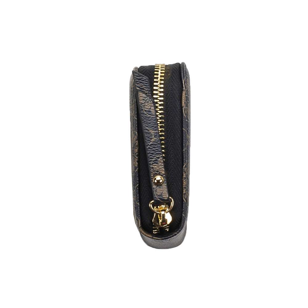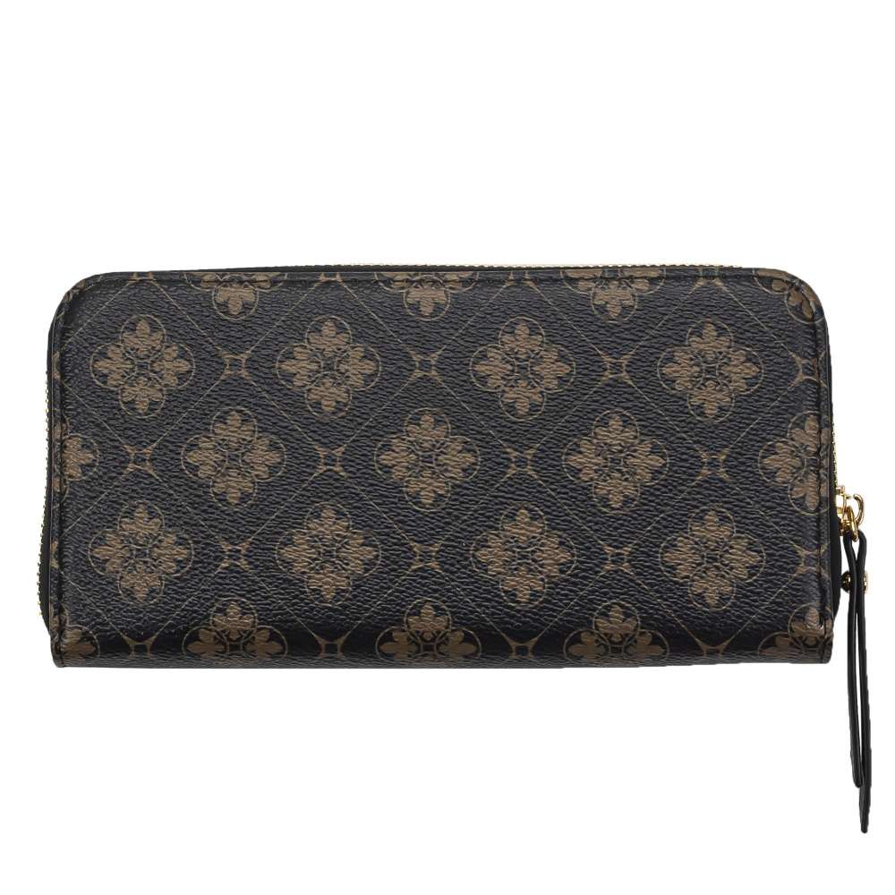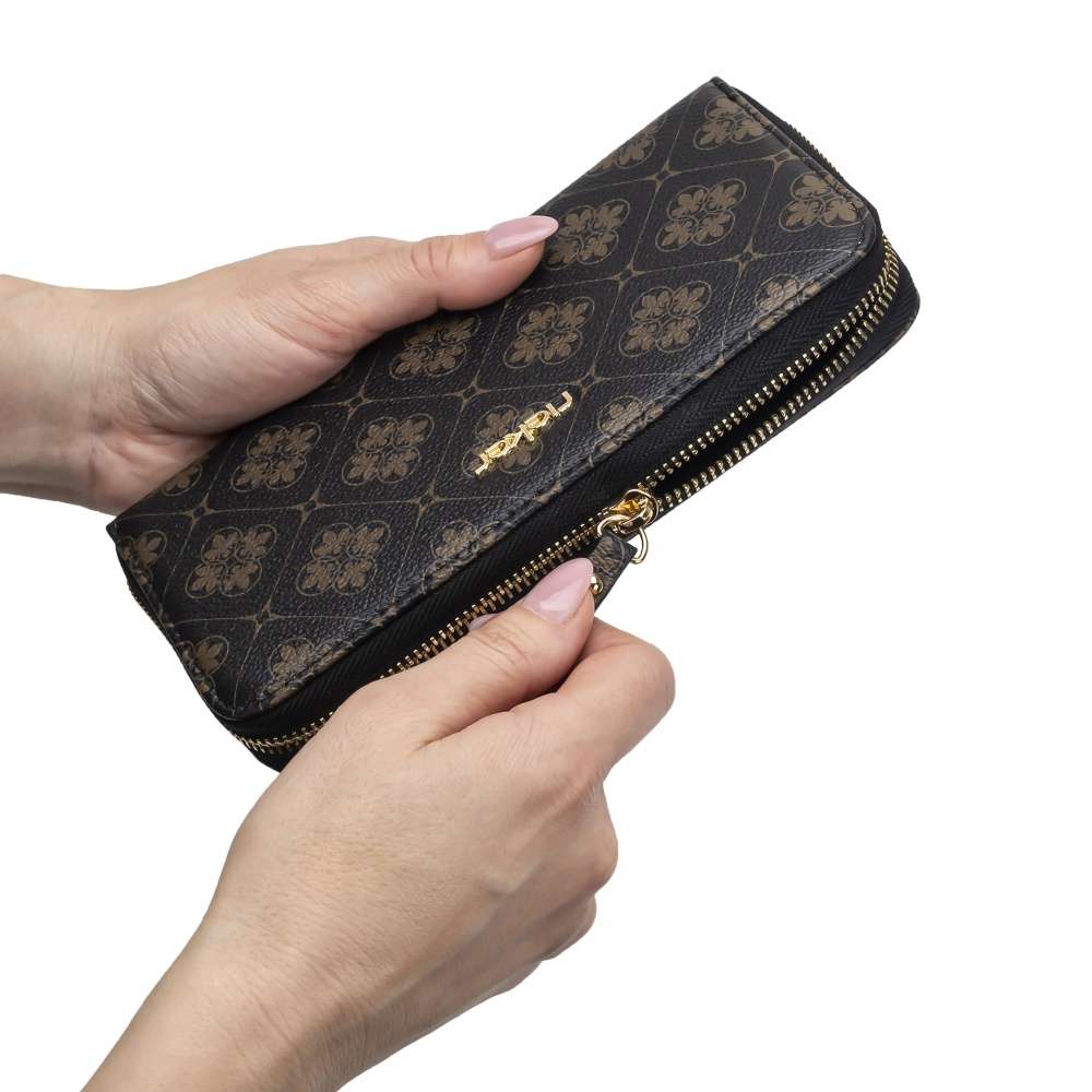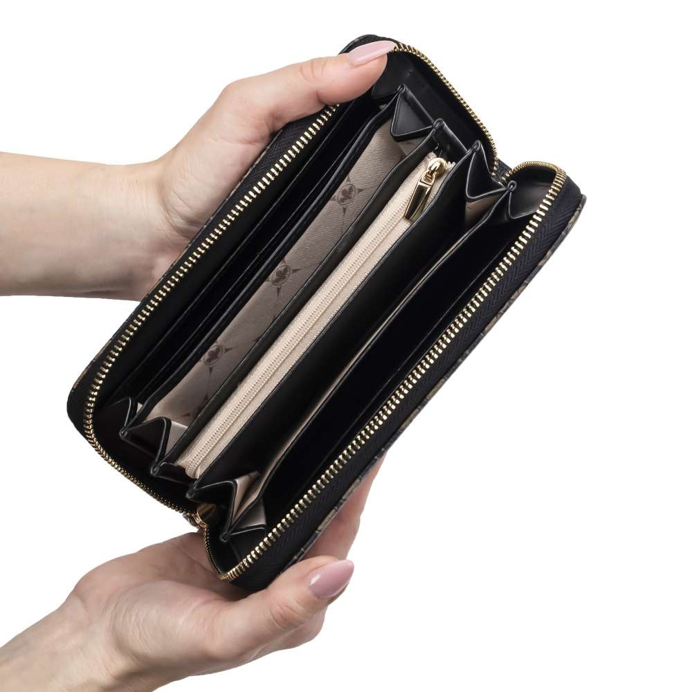 Dopřejte si tuto dámskou peněženku značky RIEKER, která vyniká svým originálním vzorem. Svrchní materiál z jemně hrubšího materiálu v černé barvě je dozdoben zlatavým nápisem. Peněženka má zip, kde po rozevření lze vidět několik kapes na karty, drobné mince nebo podélné přihrádky na bankovky. Velmi příjemný a praktický kus, který určitě každá žena ocení. Rozměry: cca v 10 cm x š 20 cm x h 3 cm