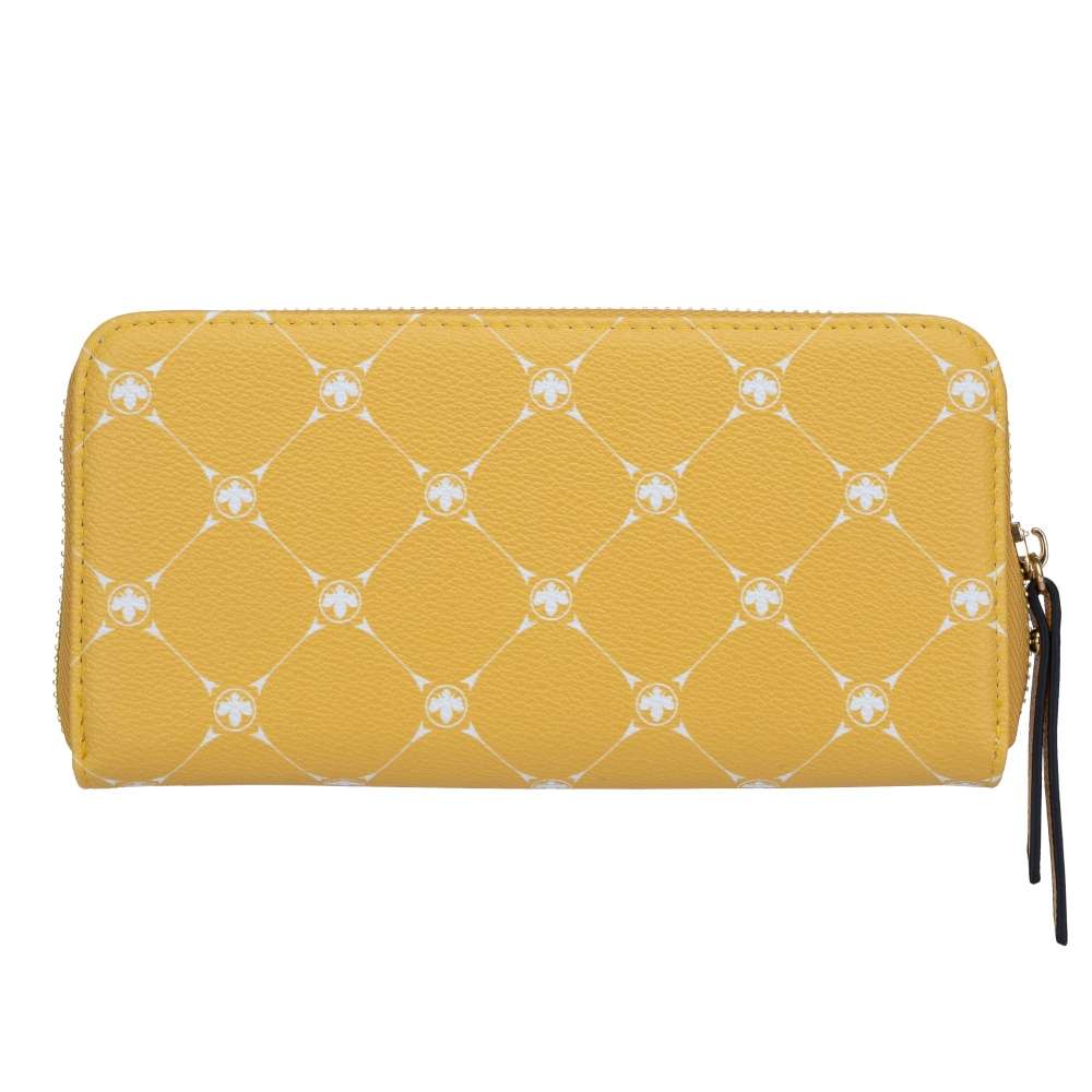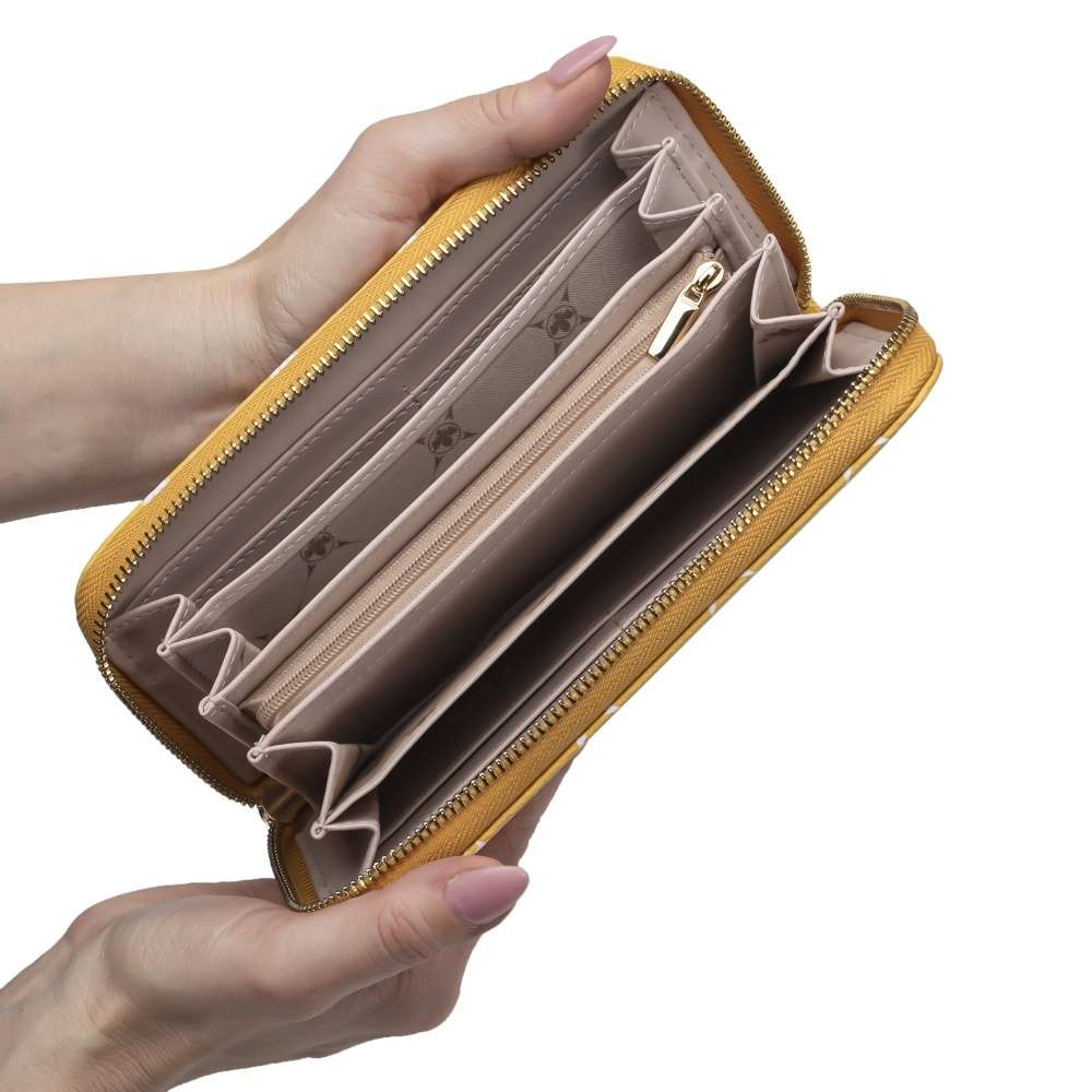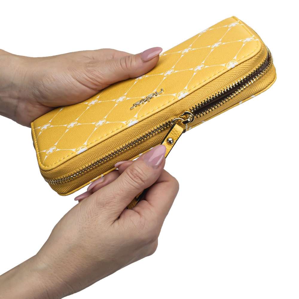 Dopřejte si tuto dámskou peněženku značky RIEKER, která vyniká svým decentním elegantním vzorem. Svrchní materiál z jemně hrubšího materiálu ve žluté barvě je dozdoben zlatavým nápisem. Peněženka má zip, kde po rozevření lze vidět několik kapes na karty, drobné mince nebo podélné přihrádky na bankovky. Velmi příjemný a praktický kus, který určitě každá žena ocení. Rozměry: cca v 10 cm x š 20 cm x h 3 cm