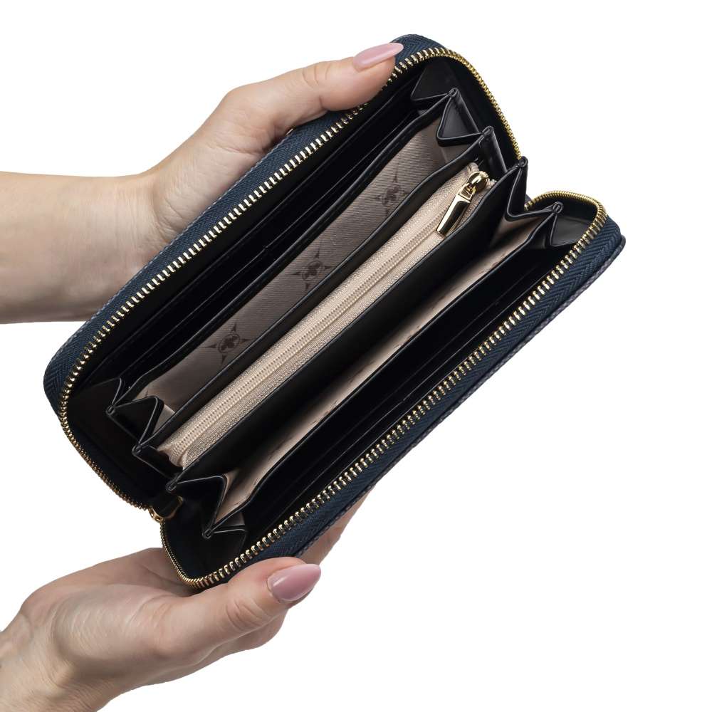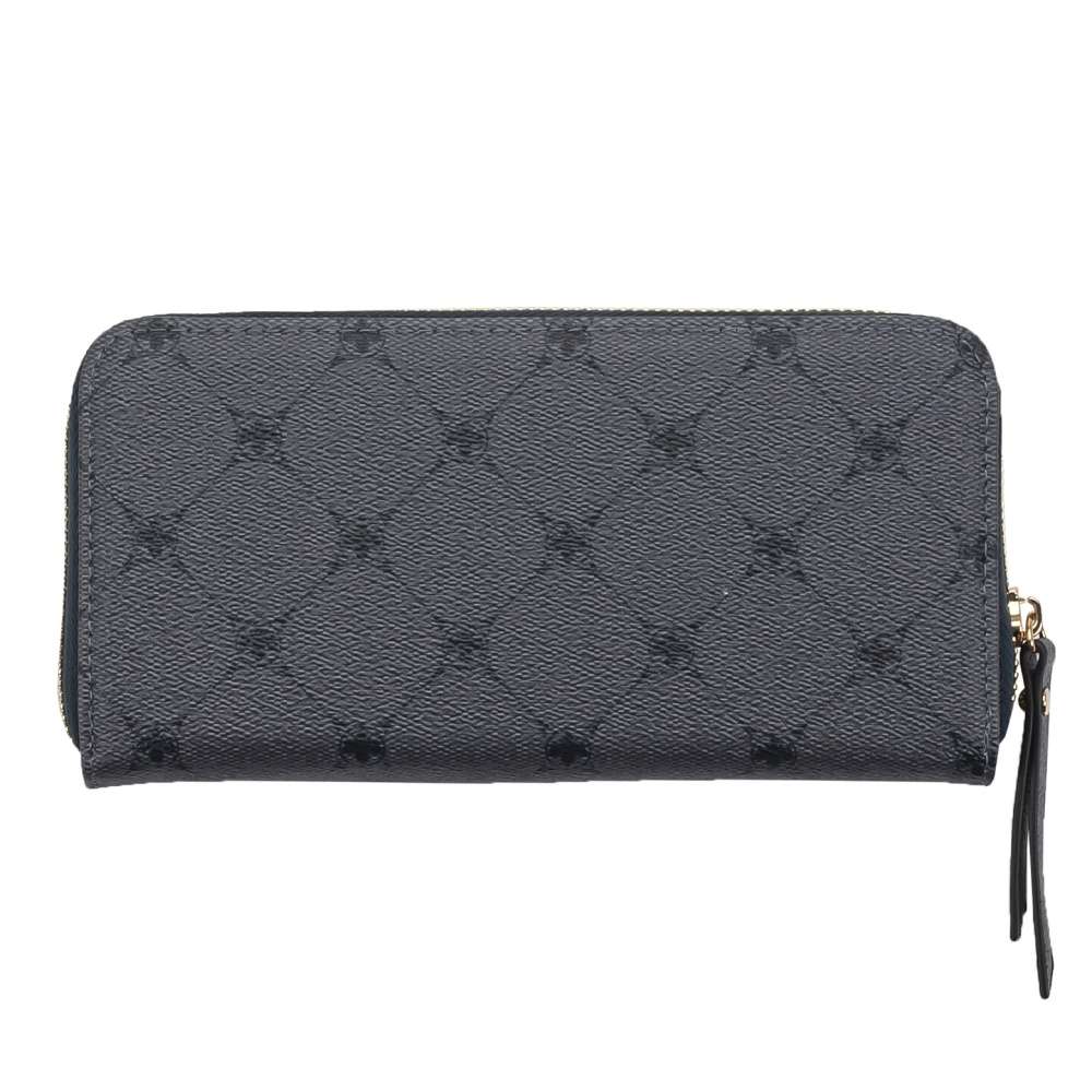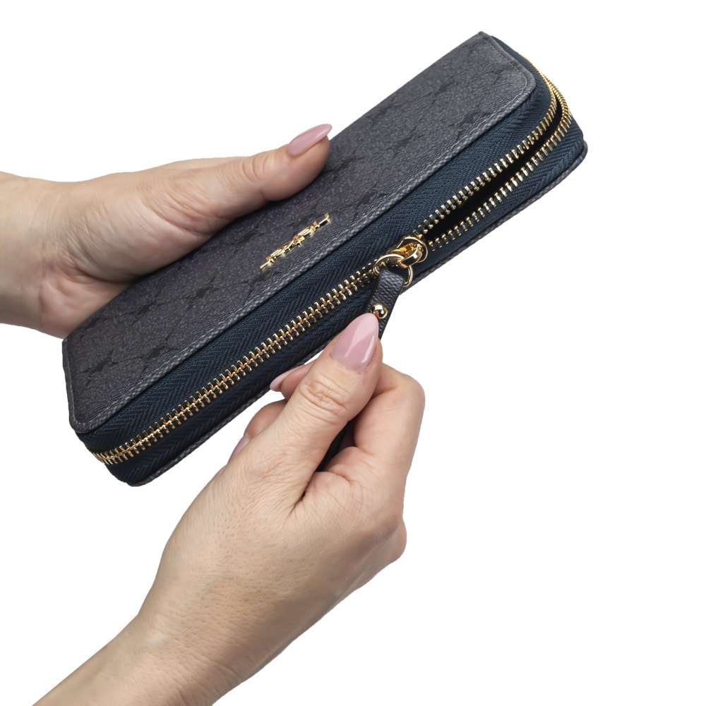 Dopřejte si tuto dámskou peněženku značky RIEKER, která vyniká svým decentním elegantním vzorem. Svrchní materiál z jemně hrubšího materiálu v tmavě šedé barvě je dozdoben zlatavým nápisem. Peněženka má zip, kde po rozevření lze vidět několik kapes na karty, drobné mince nebo podélné přihrádky na bankovky. Velmi příjemný a praktický kus, který určitě každá žena ocení. Rozměry: cca v 10 cm x š 20 cm x h 3 cm
