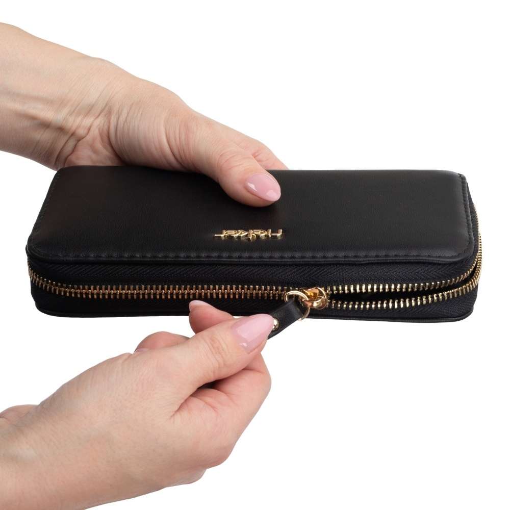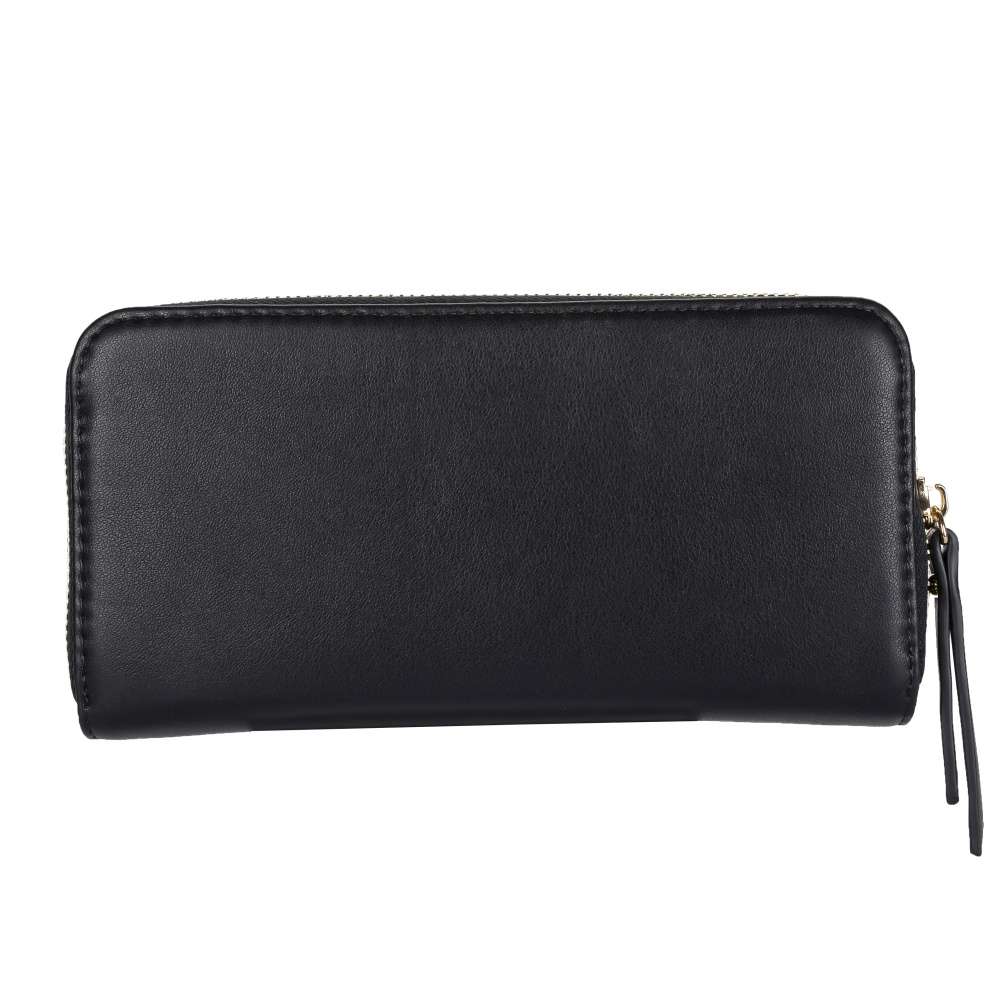 Dopřejte si tuto dámskou peněženku značky RIEKER, která vyniká svou jednoduchostí a elegantností. Svrchní materiál z hladkého materiálu v černé barvě je decentně ozdoben zlatavým nápisem. Peněženka má zip, kde po rozevření lze vidět několik kapes na karty, drobné mince nebo podélné přihrádky na bankovky. Tento model krásně sladíte ke kabelkám v naší kolekci. Rozměry: cca v 10 cm x š 20 cm x h 3 cm