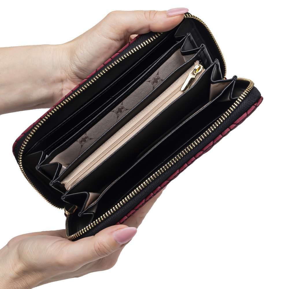 Detailní informace Originální dámská peněženka značky RIEKER, která Vás okouzlí už na první pohled. Svrchní materiál tmavě červené barvy je ozdoben designovým prošitím černou nití s nápisem. Peněženka má zip, kde po rozevření lze vidět několik kapes na karty, drobné mince nebo podélné přihrádky na bankovky. Tento krásný model se rozhodně stane Vašim oblíbeným doplňkem pro každodenní používání.