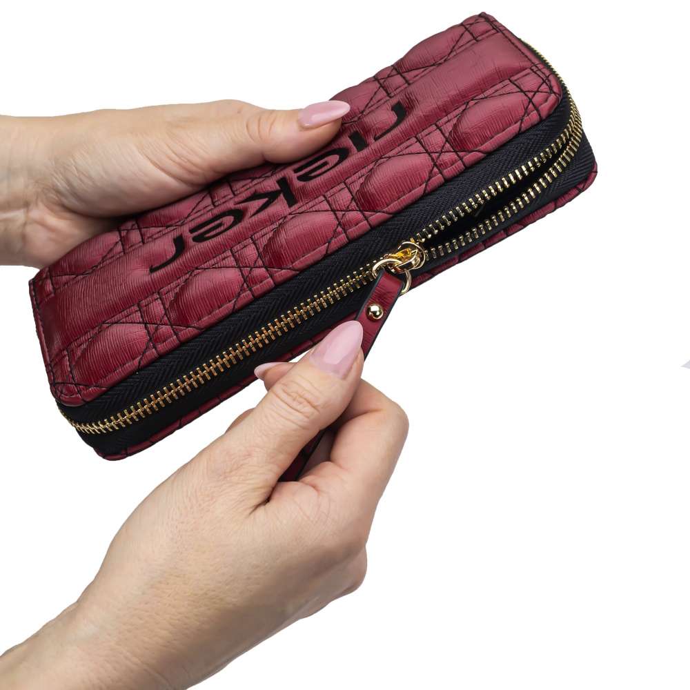 Originální dámská peněženka značky RIEKER, která Vás okouzlí už na první pohled. Svrchní materiál tmavě červené barvy je ozdoben designovým prošitím černou nití s nápisem. Peněženka má zip, kde po rozevření lze vidět několik kapes na karty, drobné mince nebo podélné přihrádky na bankovky. Tento krásný model se rozhodně stane Vašim oblíbeným doplňkem pro každodenní používání. Rozměry: cca v 10 cm x š 20 cm x h 3 cm