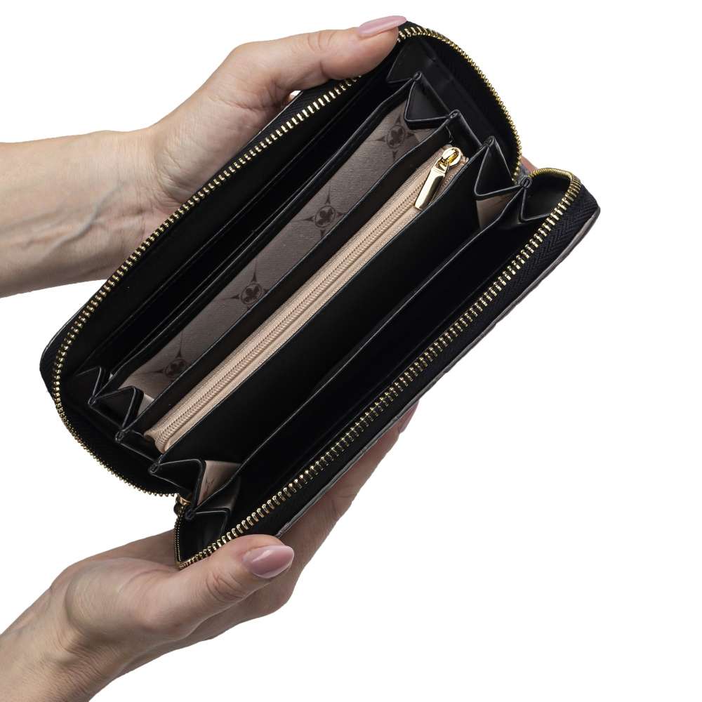 Tuto dámskou peněženku značky RIEKER si zamilujete už na první pohled. Svršek v metalické šedé barvě je obohacen vytlačeným vzorem, kde na přední straně vyniká zlatavý nápis. Peněženka má zip, kde po rozevření lze vidět několik kapes na karty, drobné mince nebo podélné přihrádky na bankovky. Tento krásný model se rozhodně stane Vašim oblíbeným doplňkem pro každodenní používání. Rozměry: cca v 10,5 cm x š 20 cm x h 3 cm