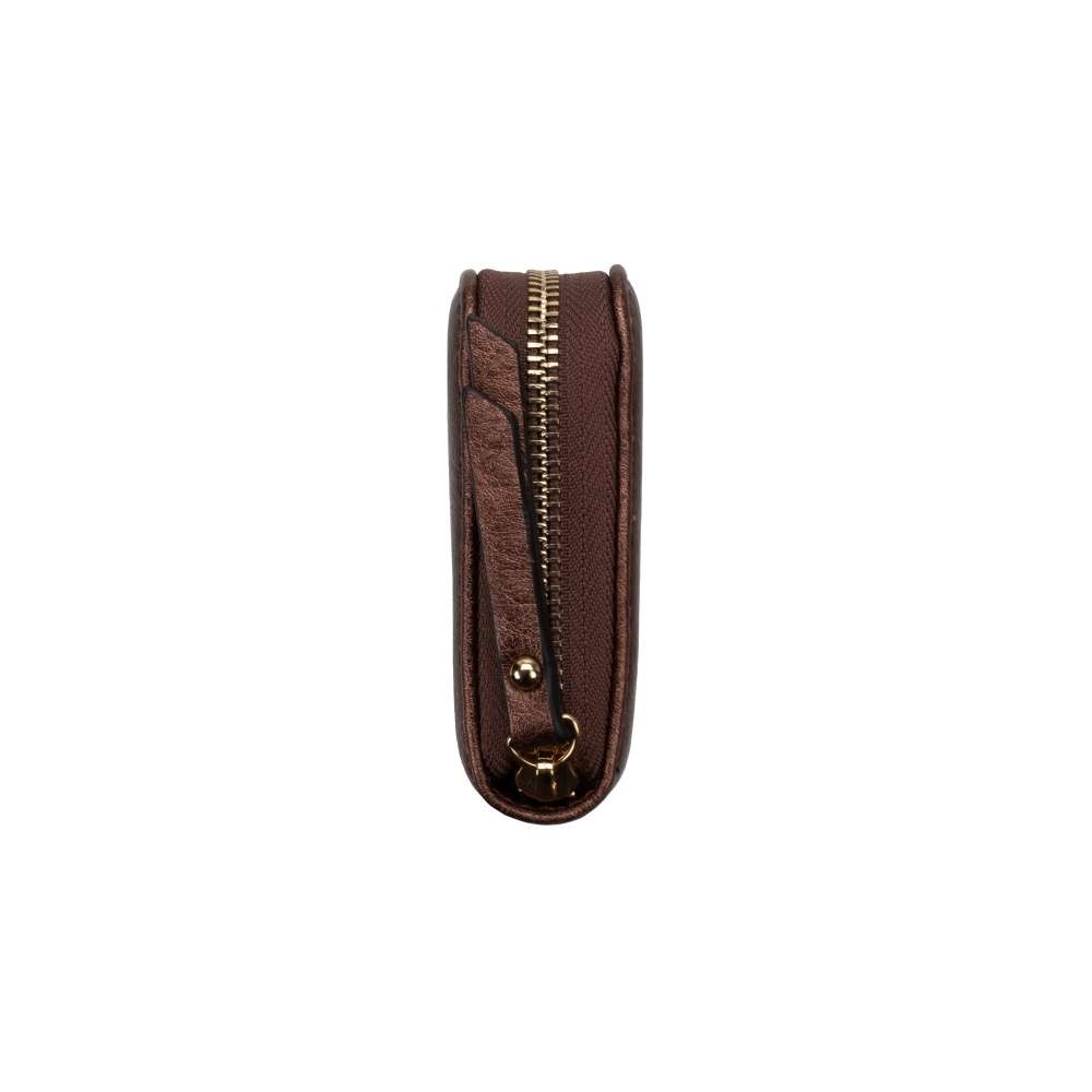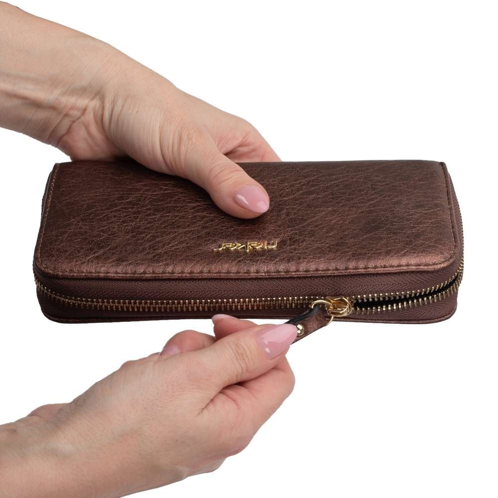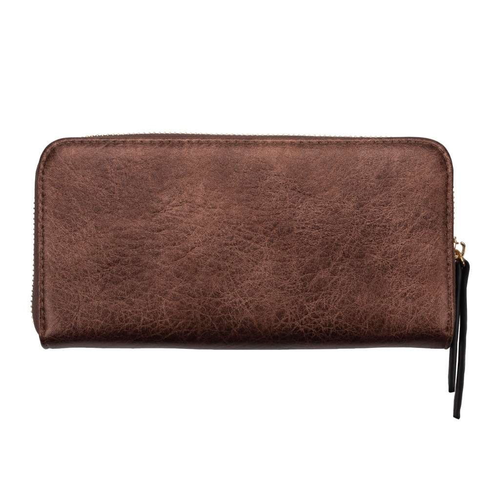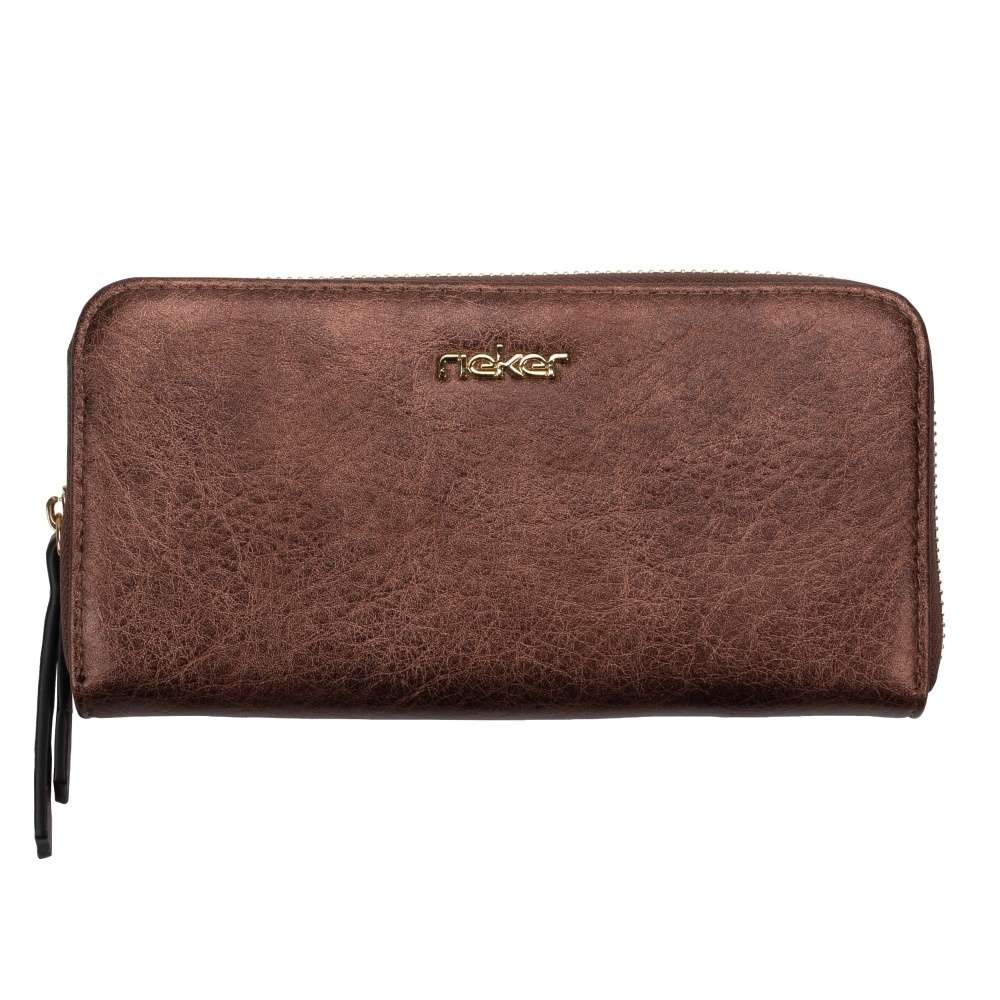 Dopřejte si tuto dámskou peněženku značky RIEKER, která vyniká svou jednoduchostí. Svrchní materiál z oblázkového materiálu v metalické hnědé barvě je decentně ozdoben zlatavým nápisem. Peněženka má zip, kde po rozevření lze vidět několik kapes na karty, drobné mince nebo podélné přihrádky na bankovky. Tento model krásně sladíte ke kabelkám v naší kolekci. Rozměry: cca v 10,5 cm x š 20 cm x h 3 cm