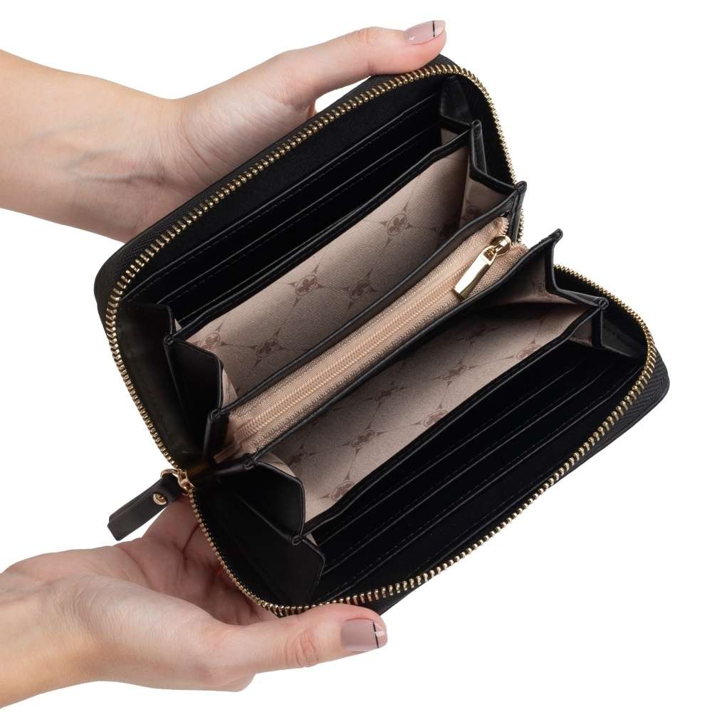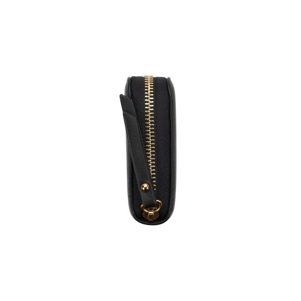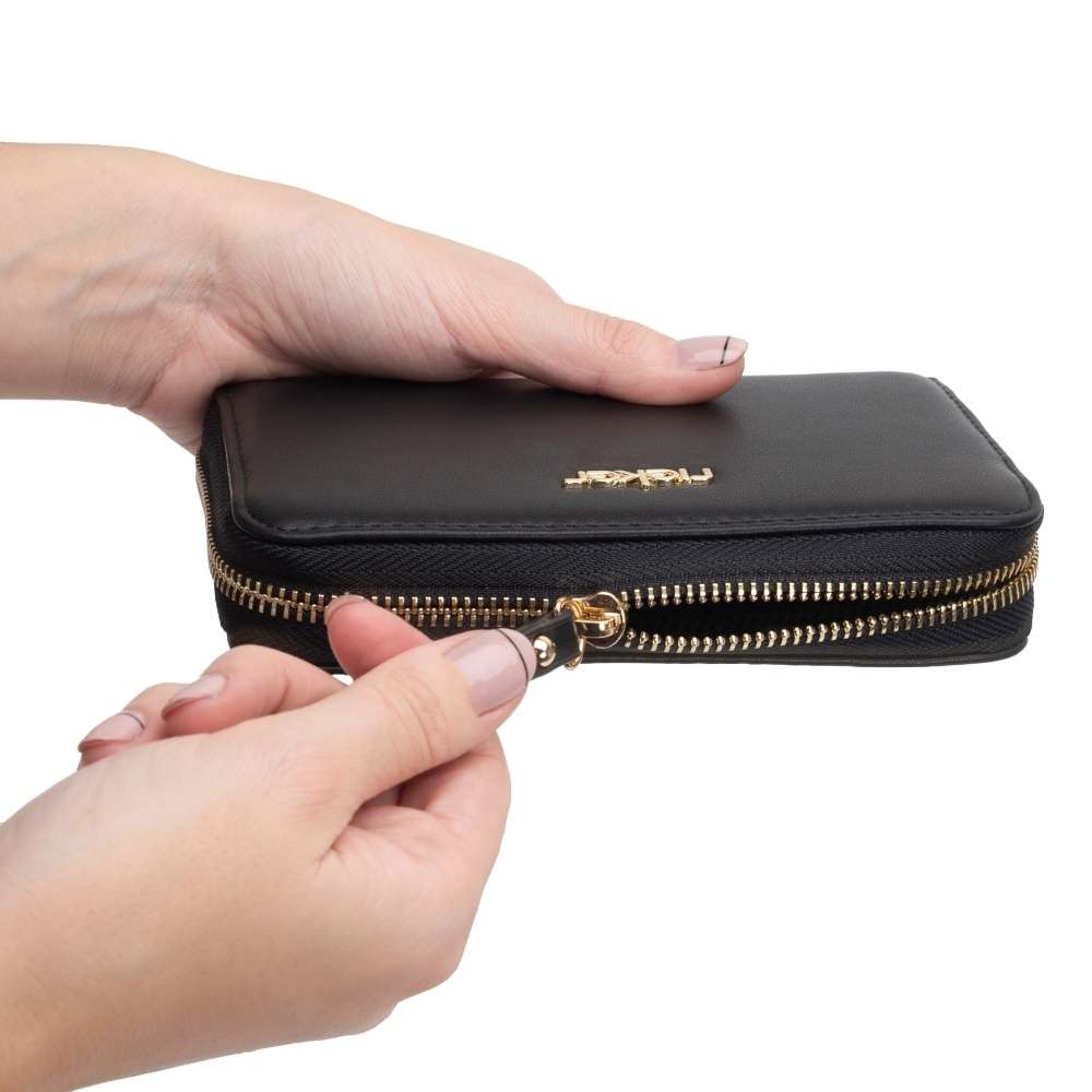 Dopřejte si tuto malou dámskou peněženku značky RIEKER, která vyniká svou jednoduchostí a elegantností. Svrchní materiál z hladkého materiálu v černé barvě je decentně ozdoben zlatavým nápisem. Peněženka má zip, kde po rozevření lze vidět několik kapes na karty, drobné mince nebo podélné přihrádky na bankovky. Tento model krásně sladíte ke kabelkám v naší kolekci. Rozměry: cca v 10 cm x š 16 cm x h 3 cm