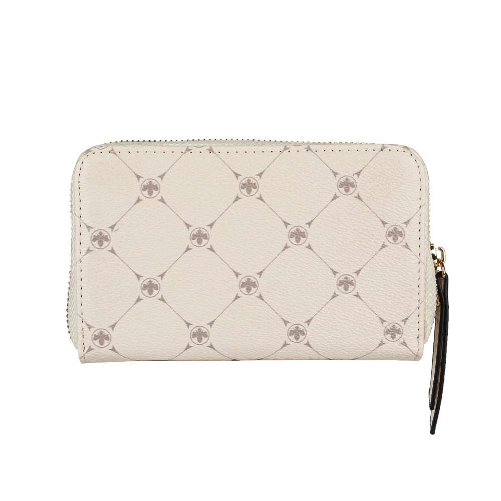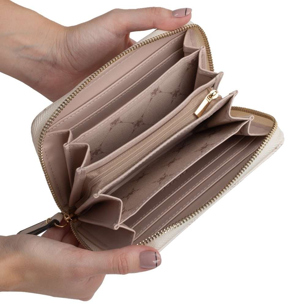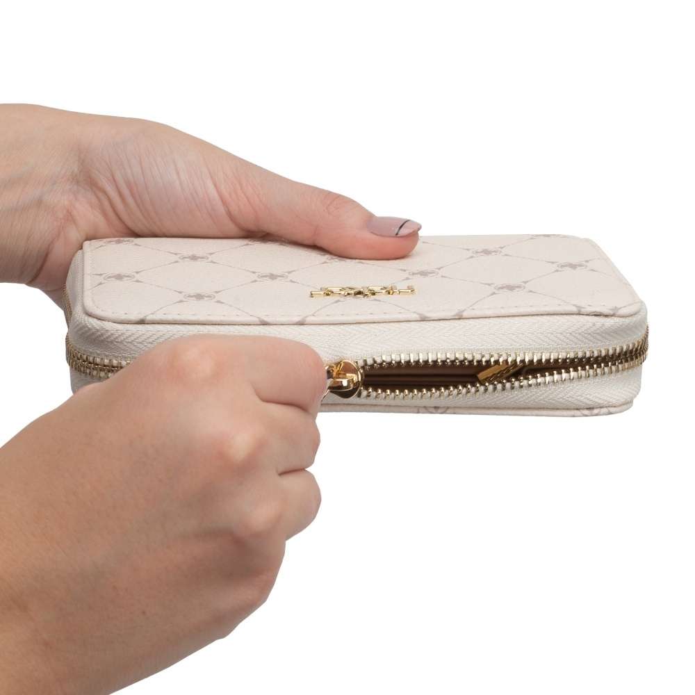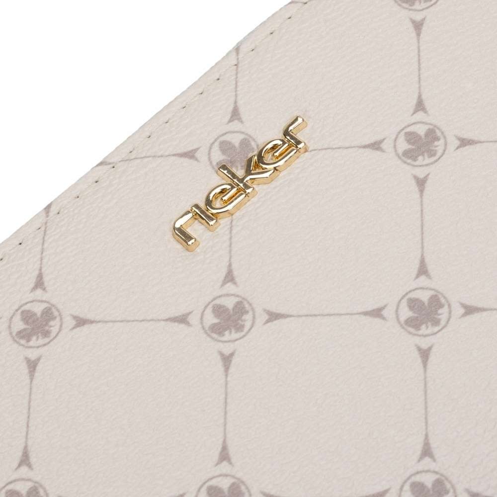 Dopřejte si tuto malou dámskou peněženku značky RIEKER, která vyniká svým decentním elegantním vzorem. Svrchní materiál z jemně hrubšího materiálu ve světle béžové barvě je dozdoben zlatavým nápisem. Peněženka má zip, kde po rozevření lze vidět několik kapes na karty, drobné mince nebo podélné přihrádky na bankovky. Tento model krásně sladíte ke kabelkám v naší kolekci.