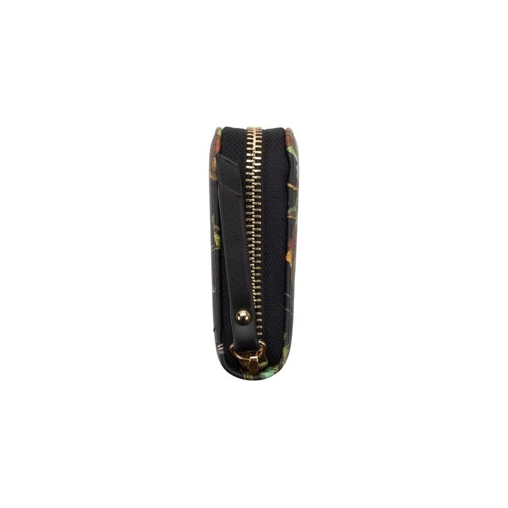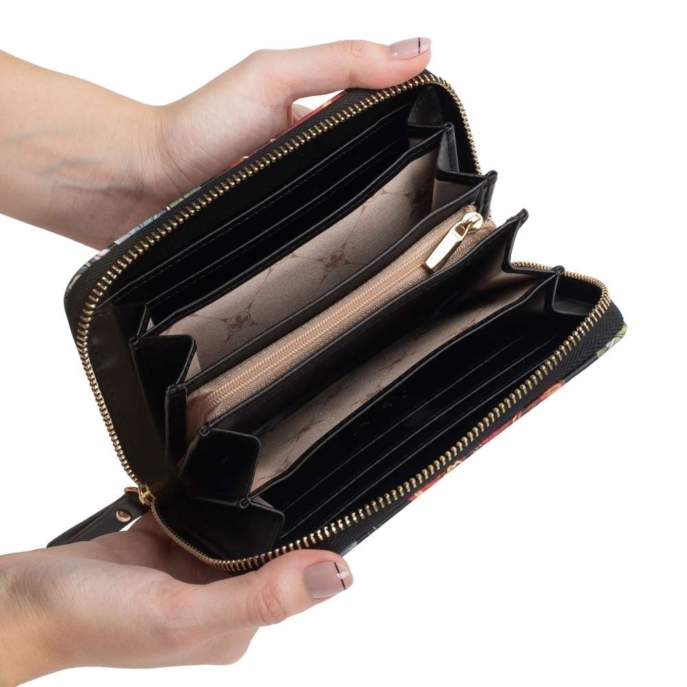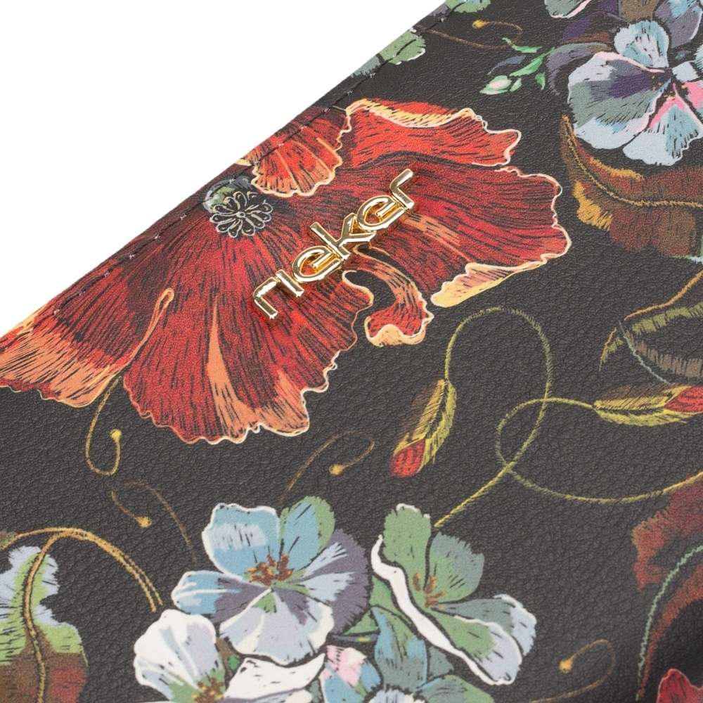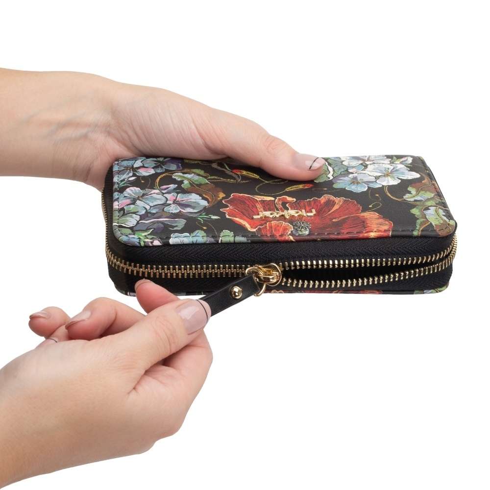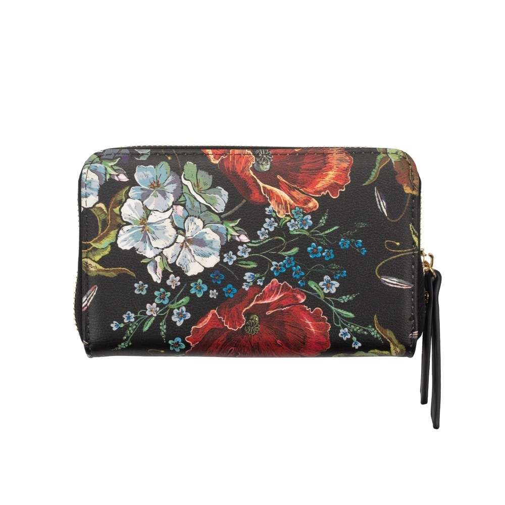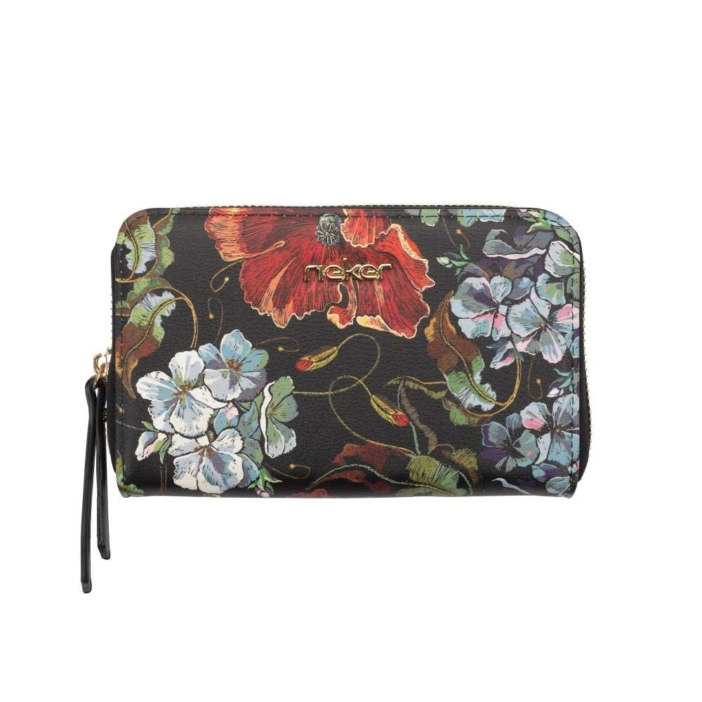 Malá dámská peněženka značky RIEKER, která Vás okouzlí už na první pohled. Svrchní materiál černé barvy je doplněn barevnými květinami, které vytváří dokonalý celkový vzhled. Peněženka má zip, kde po rozevření lze vidět několik kapes na karty, drobné mince nebo podélné přihrádky na bankovky. Tento krásný model se rozhodně stane Vašim oblíbeným doplňkem pro každodenní používání. Rozměry: cca v 10 cm x š 16 cm x h 3 cm