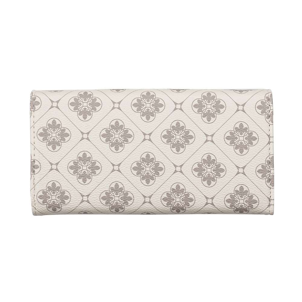 Dopřejte si tuto dámskou peněženku značky RIEKER v módním provedení. Svrchní materiál v béžové barvě je dozdoben stylovým vzorem, na kterém vyniká na přední straně zlatavý nápis. Peněženka má klopu na kovový cvoček, kde po rozevření lze vidět například několik dalších kapsiček na karty, drobné mince nebo podélné přihrádky na bankovky. Velmi vkusný a praktický kus, který určitě každá ocení. Rozměry: cca v 10 cm x š 19 cm x h 4 cm