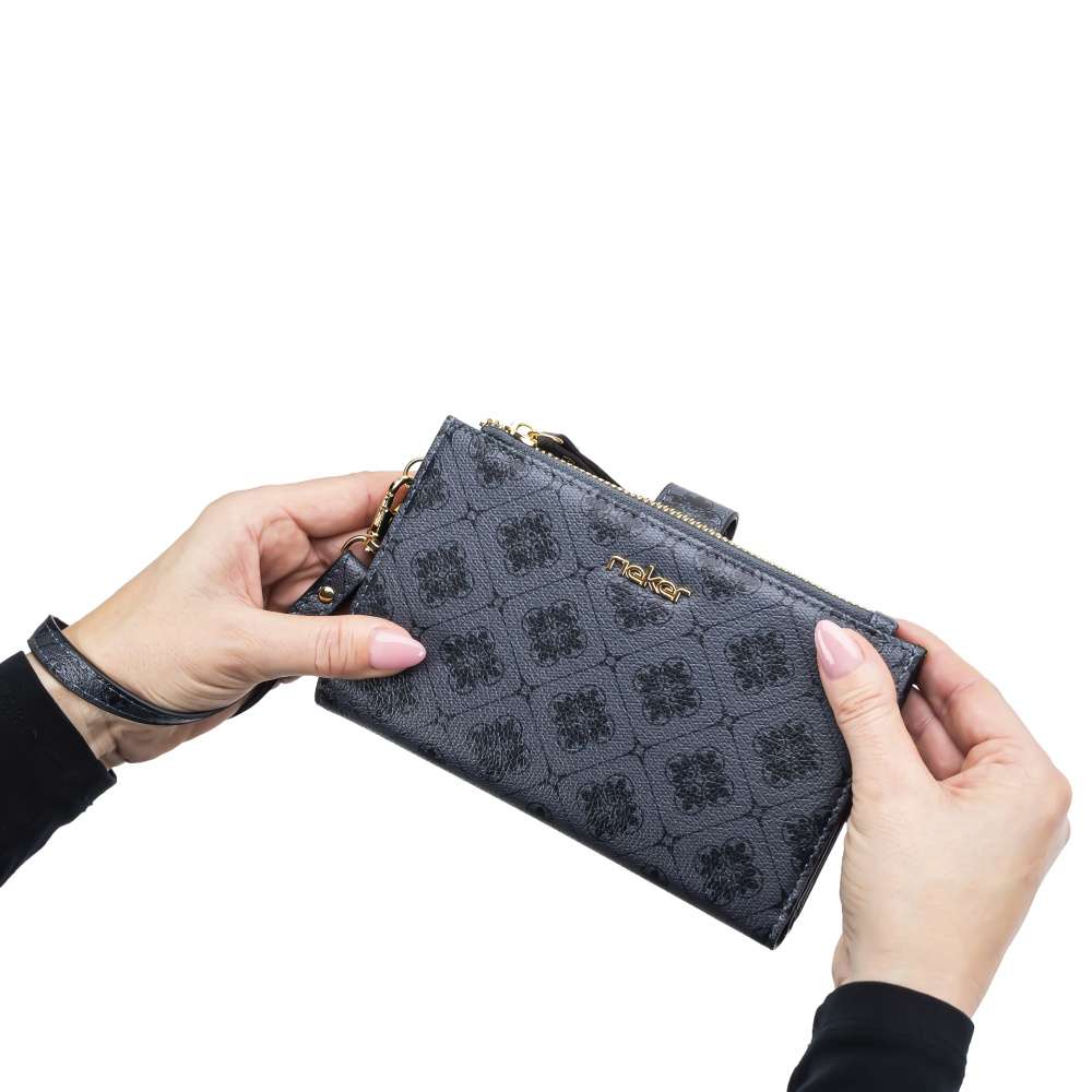 Detailní informace Tuto dámskou peněženku značky RIEKER si oblíbíte díky praktickému provedení. Svršek v tmavě šedé barvě je dozdoben stylovým vzorem, zlatavým nápisem a odepínatelným poutkem. Peněženka má dvě kapsy zapínatelné zipem a celkově se uzavírá páskem s drukem. Po rozevření peněženky lze vidět několik dalších kapsiček na karty, mobilní telefon nebo podélné přihrádky na bankovky. Tento krásný model se rozhodně stane Vašim oblíbeným doplňkem pro každodenní používání.