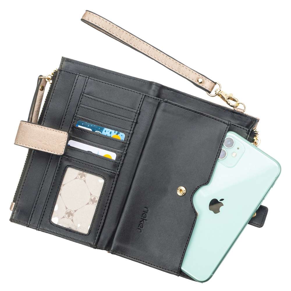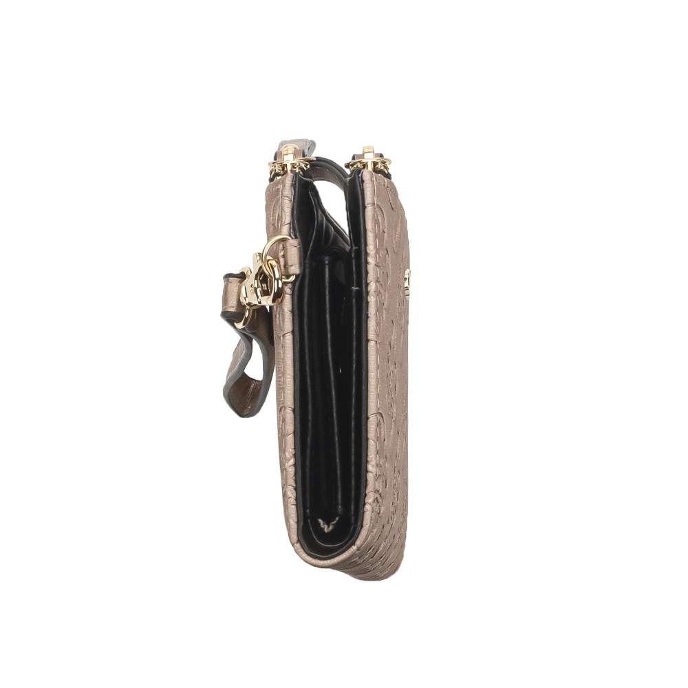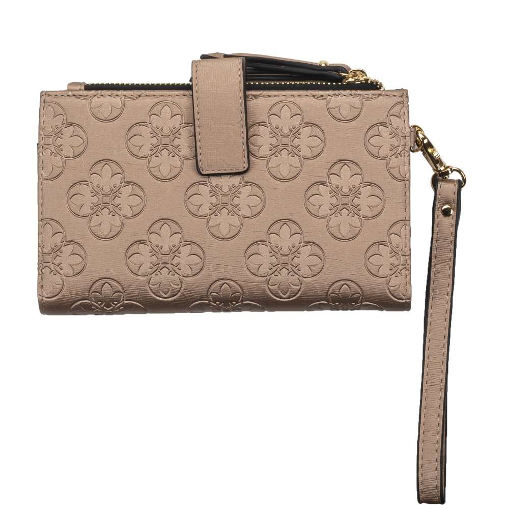 Tato dámská peněženka značky RIEKER Vás okouzlí svým stylovým provedením. Svršek v metalické béžové barvě je dozdoben vytlačeným vzorem, zlatavým nápisem a odepínatelným poutkem. Peněženka má dvě kapsy zapínatelné zipem a celkově se uzavírá páskem s drukem. Po rozevření peněženky lze vidět několik dalších kapsiček na karty, mobilní telefon nebo podélné přihrádky na bankovky. Tato peněženka Vám bude věrným společníkem každý den. Rozměry: cca v 12 cm x š 18,5 cm x h 3 cm