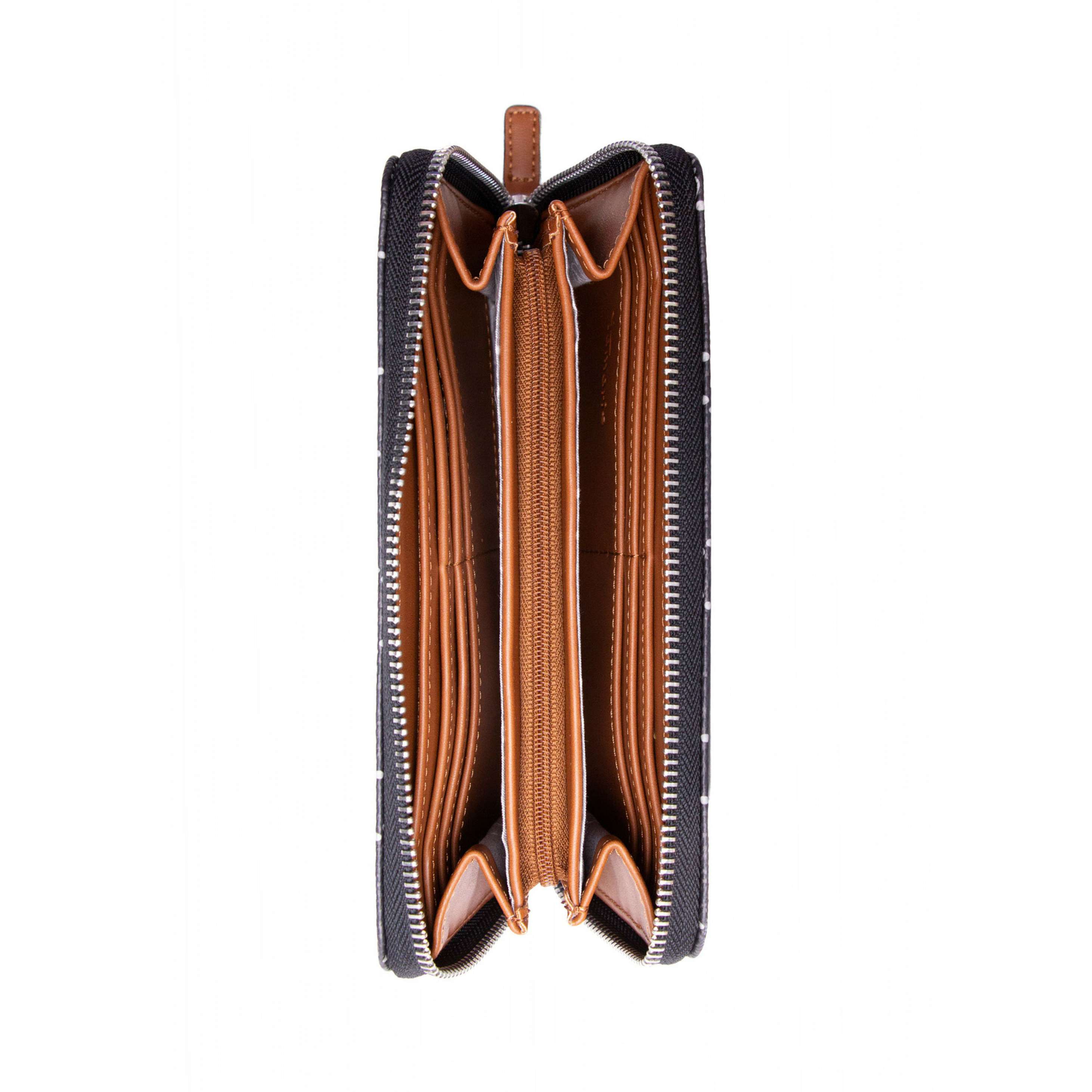 Jednoduchý a nadčasový model je přesně tím pravým, co vystihuje tuto nádhernou TAMARIS peněženku. Svrchní materiál je jemné struktury s potiskem, kde doplňujícím prvkem je jemné prošití v okraji. K zapínání slouží zip, kdy po jeho rozepnutí uvnitř najdeme praktické kapsičky na karty, papírové peníze a kapsičku uzavíratelnou zipem, vhodnou třeba na drobné mince. Tato peněženka bude skvělým doplňkem ke kabelce TAMARIS v naší kolekci.