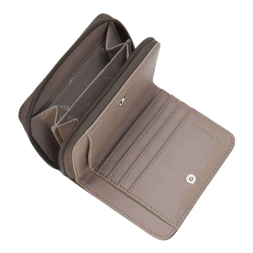 Jednoduchý a nadčasový model je přesně tím pravým, co vystihuje tuto nádhernou TAMARIS peněženku. Svrchní materiál je jemné struktury a je jemně prošit, kde doplňujícím prvkem je malé logo značky TAMARIS. K zapínání slouží zip po celém obvodu, kdy po jeho rozepnutí uvnitř najdeme praktické kapsičky na karty a zip na drobáky. Tato peněženka bude skvělým doplňkem ke kabelce TAMARIS v naší kolekci.