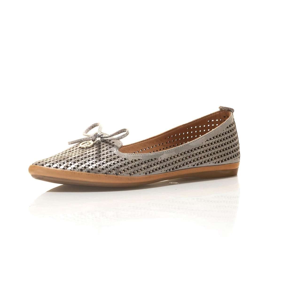 Dámské balerínky ušité z pravé kůže v bílé či růžové barvě jsou zdobené perforací, kovovou aplikací na nártu i mašlí. Mají hladký povrch a užší špičku. Tento elegantní model unosíte jak do práce k sukni, tak na procházky městem.