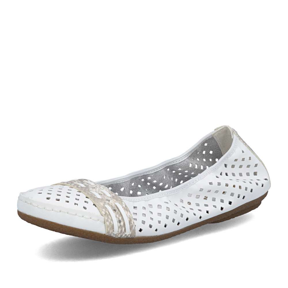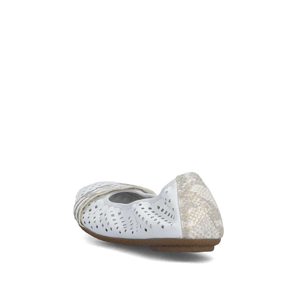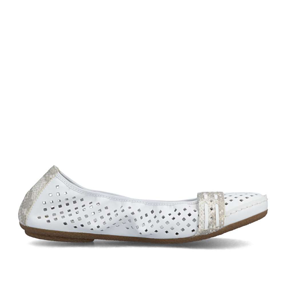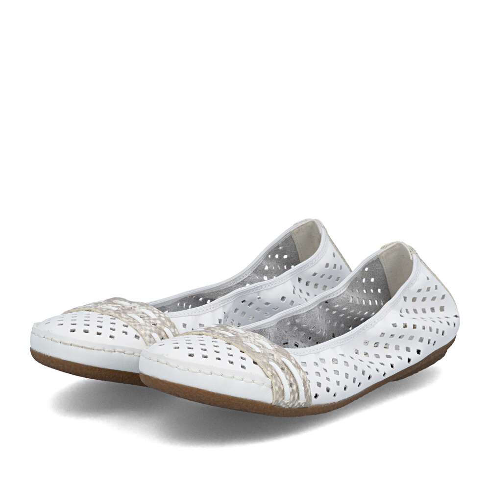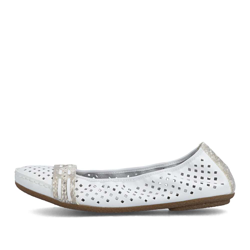 Nádherné letní baleríny značky Rieker, budou tou správnou volbou na léto. Bílý svršek je originálně perforovaný a zdobí ho pásky ve zvířecím designu přes nárt a patu. Měkká kožená stélka a kvalitní podešev s Antistress technologií Vám zajistí pocit pohodlí po celou dobu nošení. Baleríny se Vám budou hodit nejen k sukni a šatům, ale také je unosíte ke kalhotám.