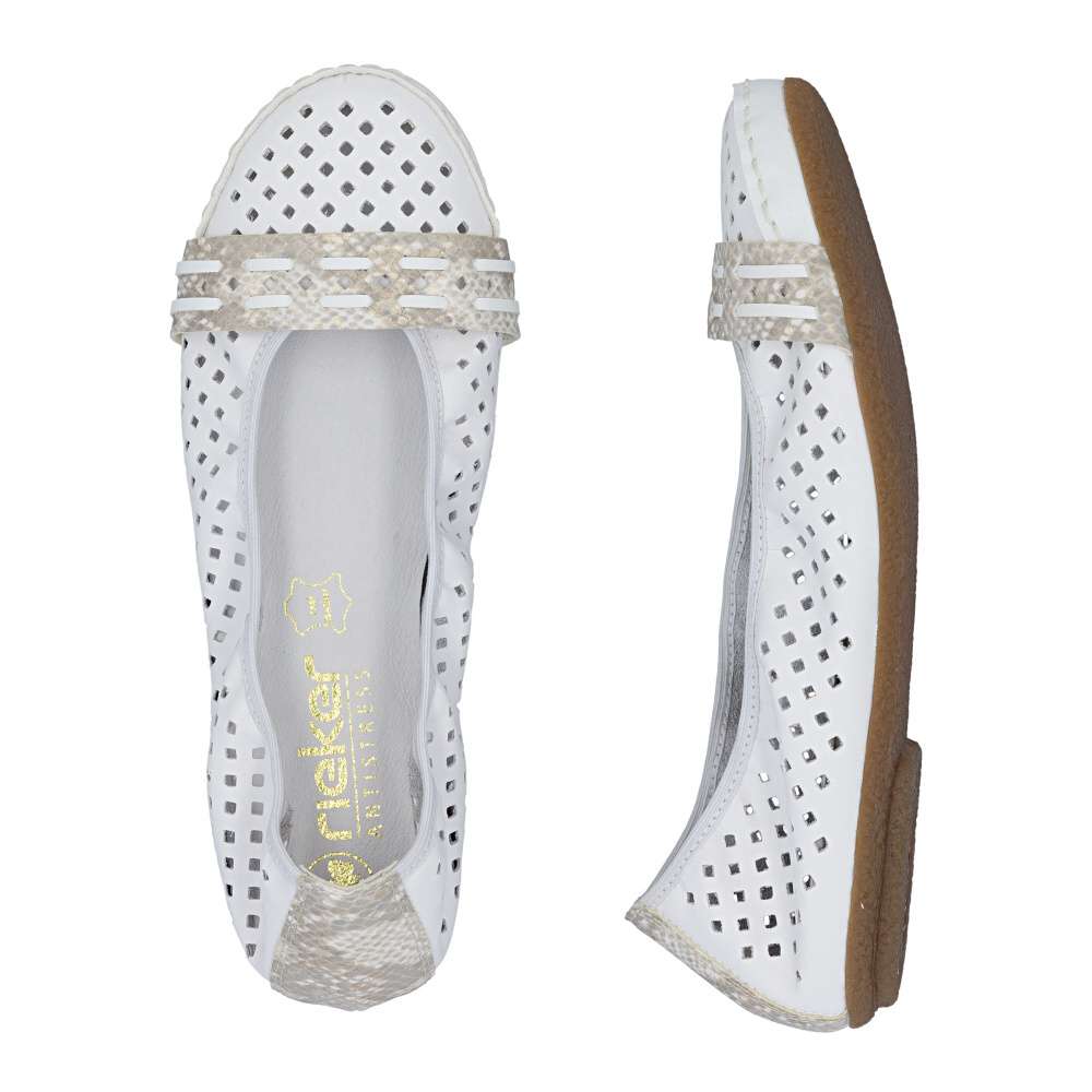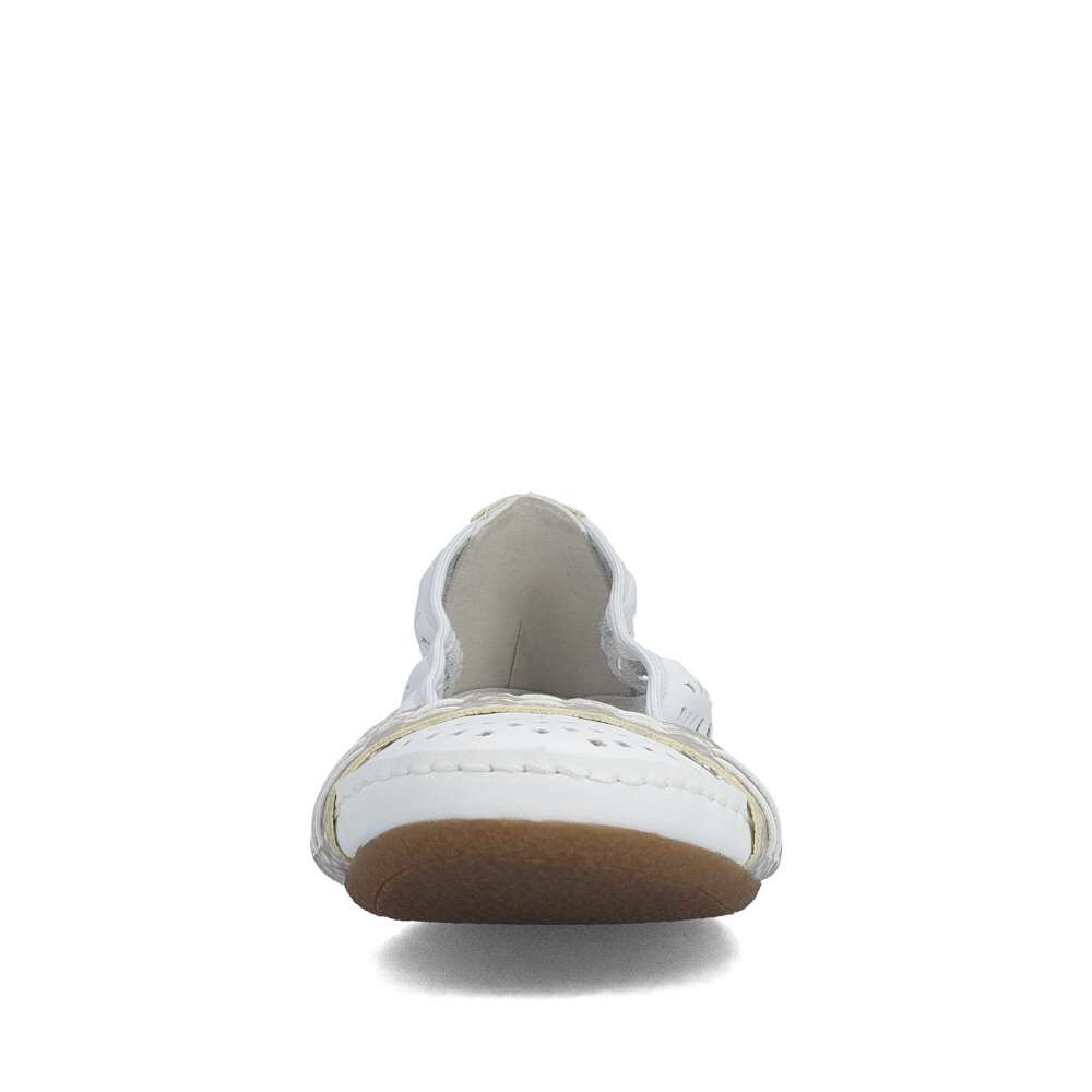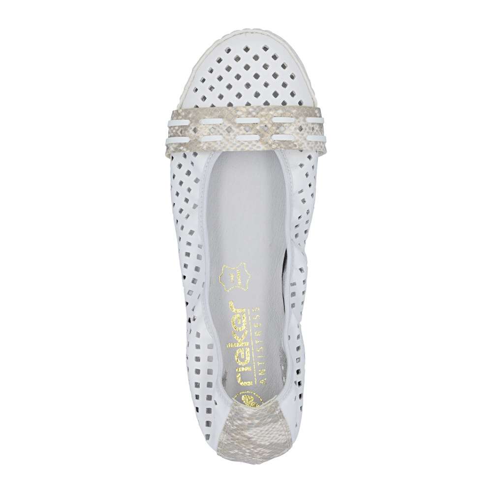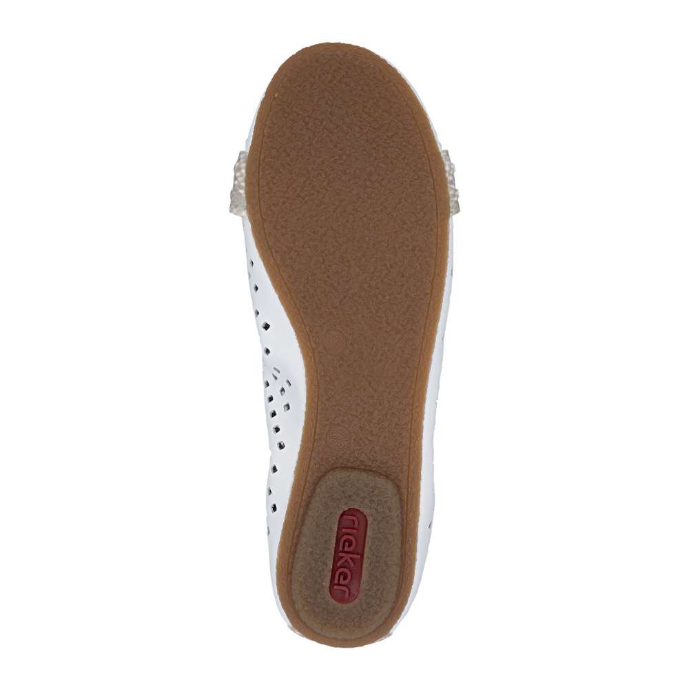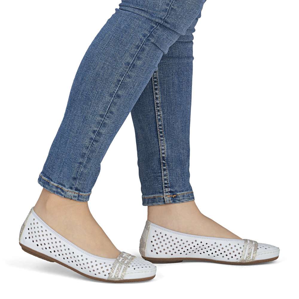 Nádherné letní baleríny značky Rieker, budou tou správnou volbou na léto. Bílý svršek je originálně perforovaný a zdobí ho pásky ve zvířecím designu přes nárt a patu. Měkká kožená stélka a kvalitní podešev s Antistress technologií Vám zajistí pocit pohodlí po celou dobu nošení. Baleríny se Vám budou hodit nejen k sukni a šatům, ale také je unosíte ke kalhotám.