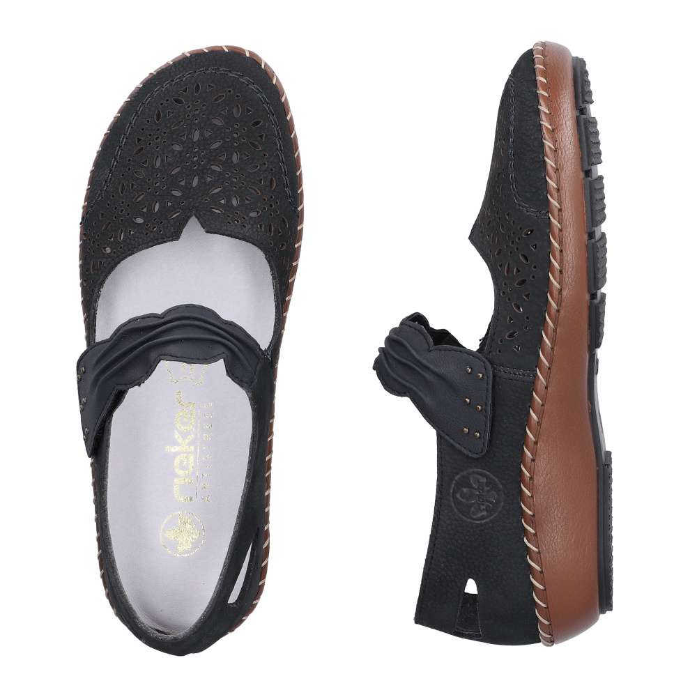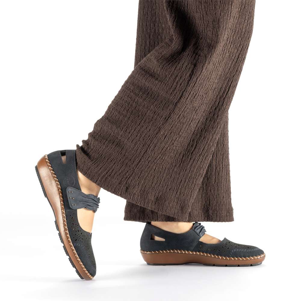 Pohodlí během teplých dnů vám zaručí tyto šarmantní boty RIEKER. Tmavě modrý kožený svršek je ozdoben elegantní perforací, která přidává stylový detail. Pásek přes nárt se suchým zipem je také designově propracovaný, navíc umožňuje snadné nazutí a přizpůsobení dle vašich potřeb. Maximální komfort při nošení zajistí kožená stélka a podešev tlumící nárazy při chůzi, která zajišťuje příjemný krok během celého dne. Tyto boty budou ideální volbou pro každodenní komfort s dotekem elegance.