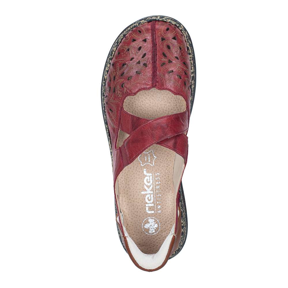 Dámská balerína značky RIEKER je zdobená kontrastním barevným spojením, perforací a vyrytými obrazci na špičce. Pásky přes nárt jsou překříženy, oba jsou doplněné o pružnou gumičku, která usnadní nejen nazouvání, ale také přizpůsobení obuvi na vaší noze. Při celodenním chození oceníte měkkou koženou stélku, která se postará o Vaše pohodlí při každém kroku. Tento model bude vhodný na běžné pochůzky městem či na dlouhých nákupech s kamarádkami. Technologie: Antistress – díky čtyřem antistresovým vlastnostem – lehkosti, pružnosti, prostornosti a vynikající absorpci nárazů – vám boty RIEKER nabídnou komfortnější chůzi. Ready2GO – nazout a jít, díky tvarově stabilní patní částí je nazouvání snadné bez použití pomůcek a rukou.