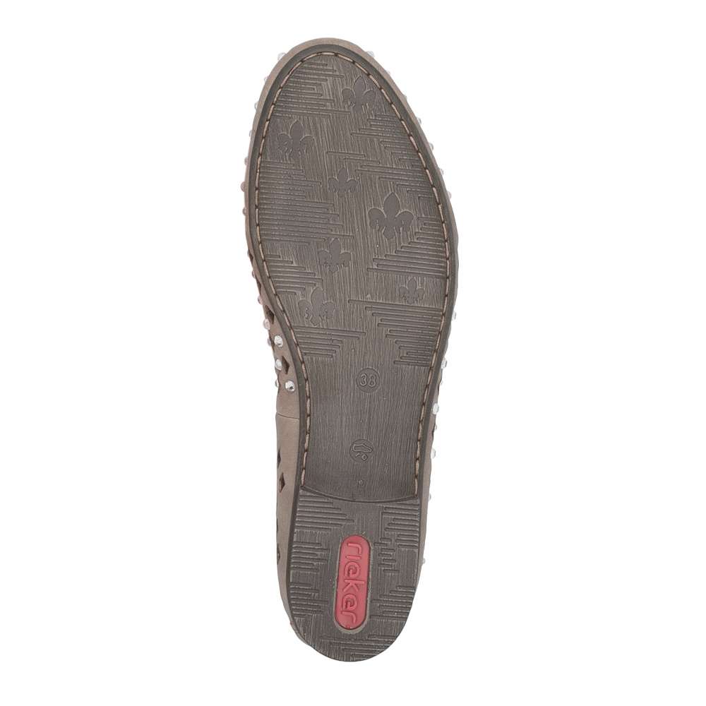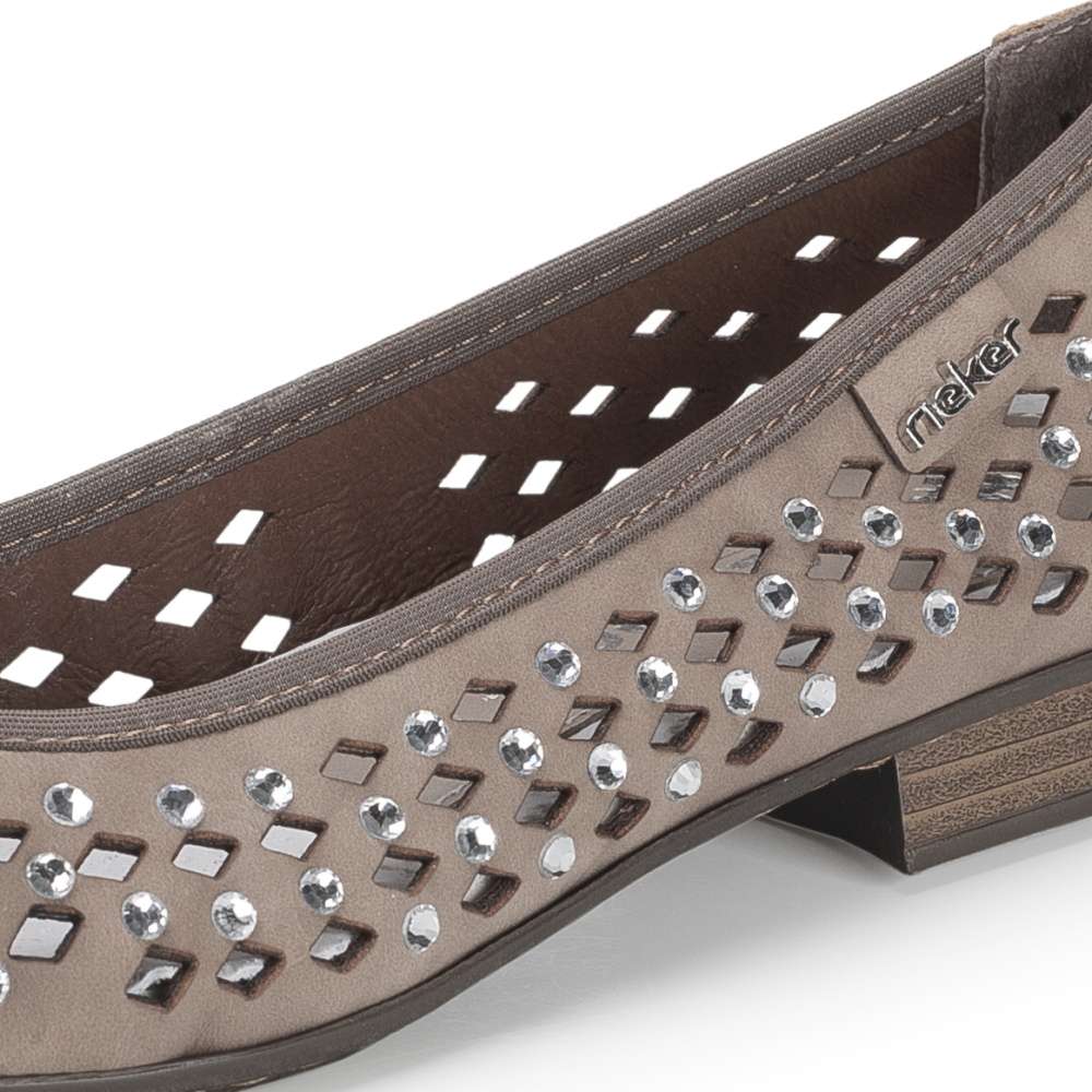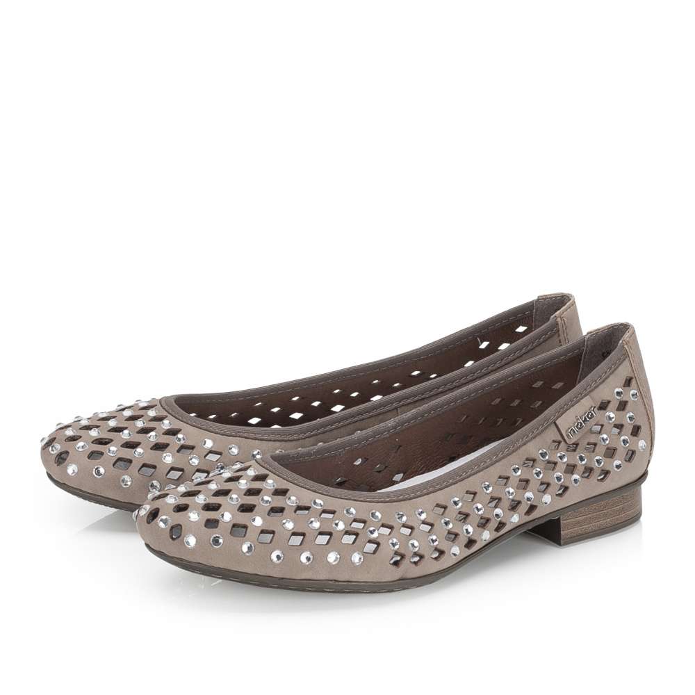 Baleríny značky RIEKER v unikátním provedení okamžitě upoutají pozornost výrazným perforovaným vzorem a jemnými odlesky kamínků po celém svršku. Jejich lehký a ženský design dodává outfitu jedinečný šarm, díky čemuž se stanou nepřehlédnutelným doplňkem. Příjemná kožená stélka zajišťuje maximální pohodlí po celý den, zatímco flexibilní podešev přirozeně kopíruje každý krok a tlumí nárazy, čímž přináší lehkost a komfort při chůzi. Tyto baleríny spojují styl, originalitu a pohodlí, takže jsou ideální volbou pro ženy, které chtějí kráčet létem s grácií a pocitem dokonalého pohodlí.
