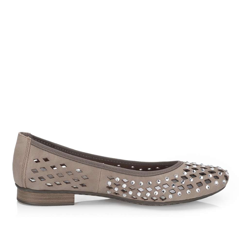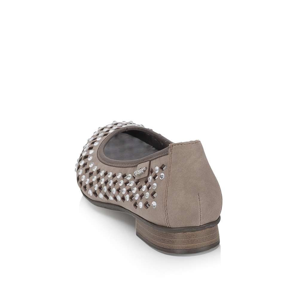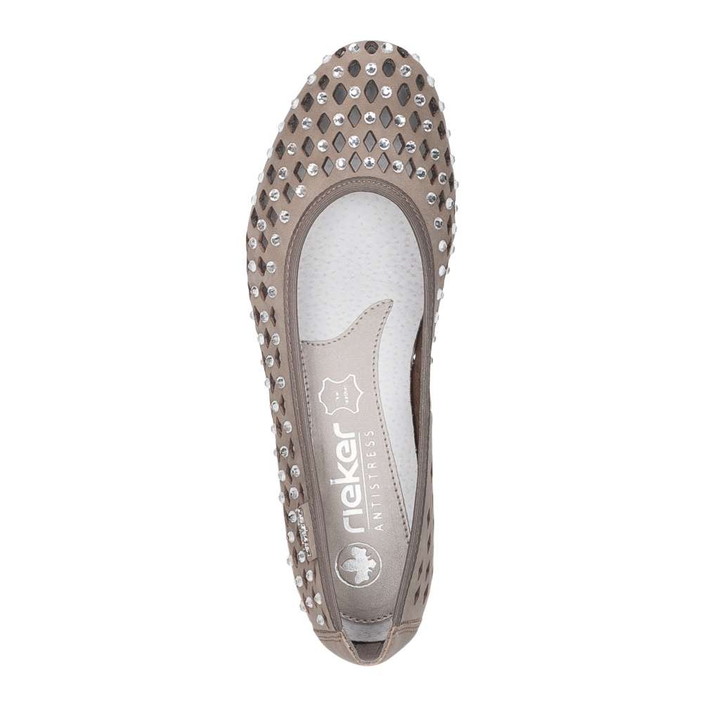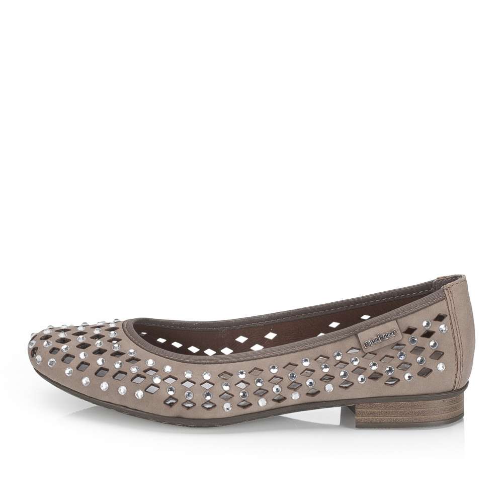 Baleríny značky RIEKER v unikátním provedení okamžitě upoutají pozornost výrazným perforovaným vzorem a jemnými odlesky kamínků po celém svršku. Jejich lehký a ženský design dodává outfitu jedinečný šarm, díky čemuž se stanou nepřehlédnutelným doplňkem. Příjemná kožená stélka zajišťuje maximální pohodlí po celý den, zatímco flexibilní podešev přirozeně kopíruje každý krok a tlumí nárazy, čímž přináší lehkost a komfort při chůzi. Tyto baleríny spojují styl, originalitu a pohodlí, takže jsou ideální volbou pro ženy, které chtějí kráčet létem s grácií a pocitem dokonalého pohodlí.