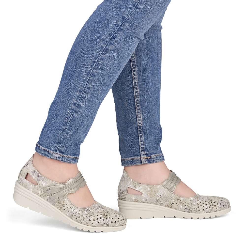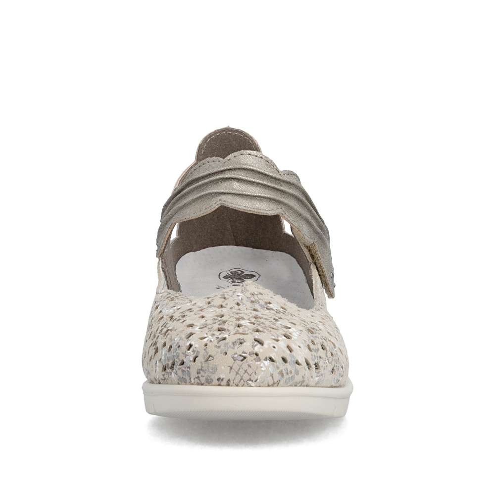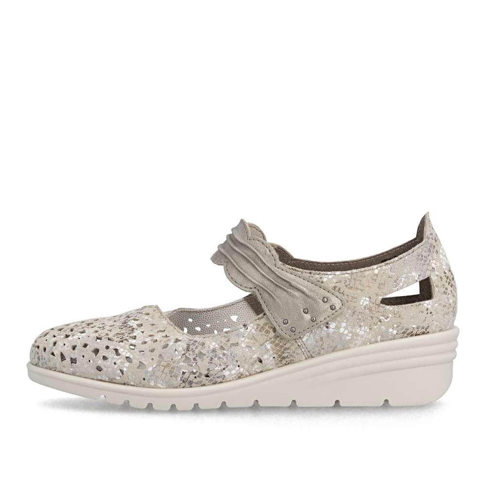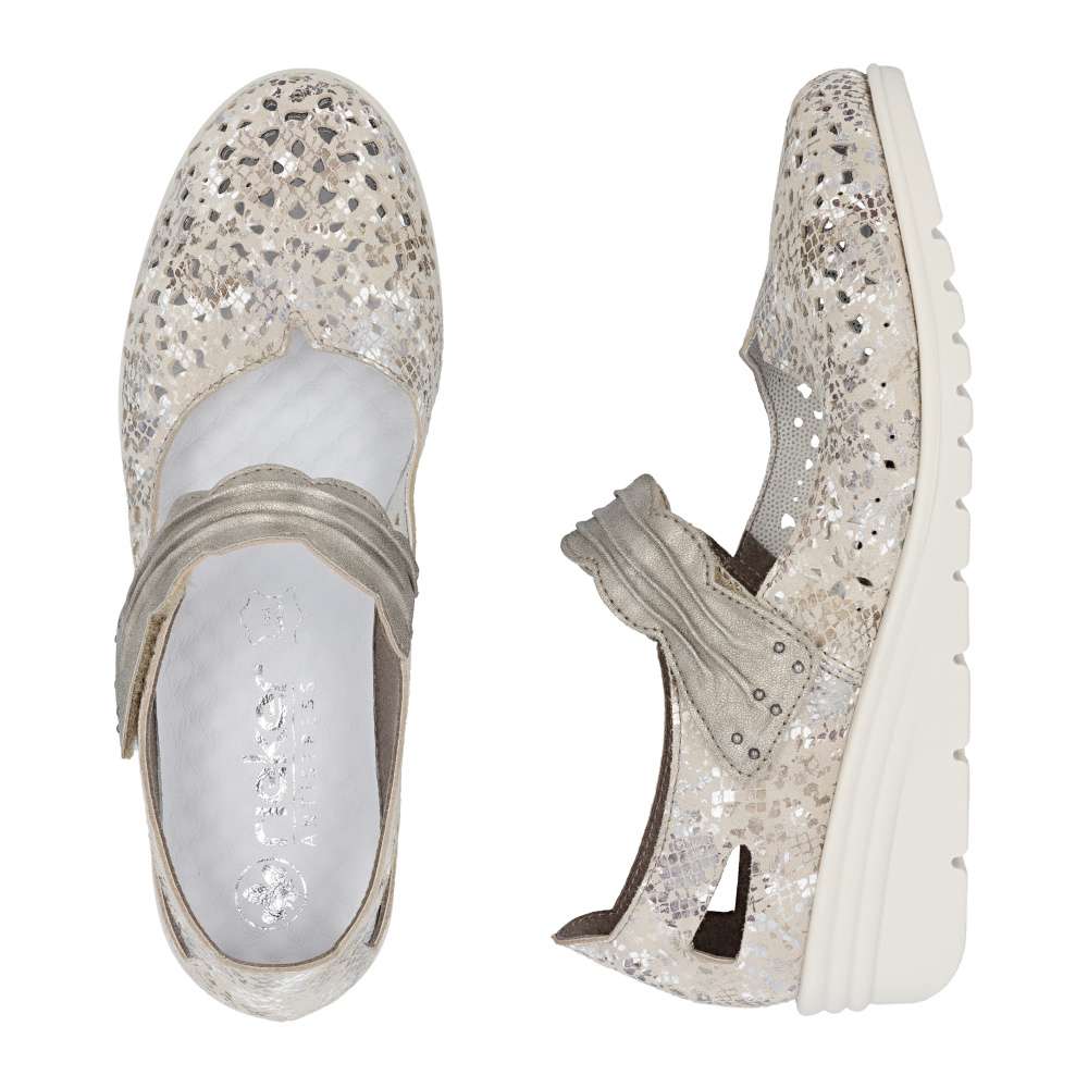 Těmto balerínám značky Rieker se jednoduše nedá odolat. Kožený svršek je posetý jemnou perforací a decentními odlesky potisku, které vytvářejí svěží vzhled. Pásek přes nárt v působivém provedení je opatřen suchým zipem, díky čemuž se baleríny snadno obouvají a dokonale přizpůsobí noze. Měkká kožená stélka zajistí příjemný pocit při každém kroku a nárazy tlumící podešev se postará o pohodlí během celého dne. Tyto baleríny nejsou jen obuví – jsou stylovým doplňkem, který podtrhne váš osobitý vkus a dodá každému outfitu noblesu a jemnou jiskru.