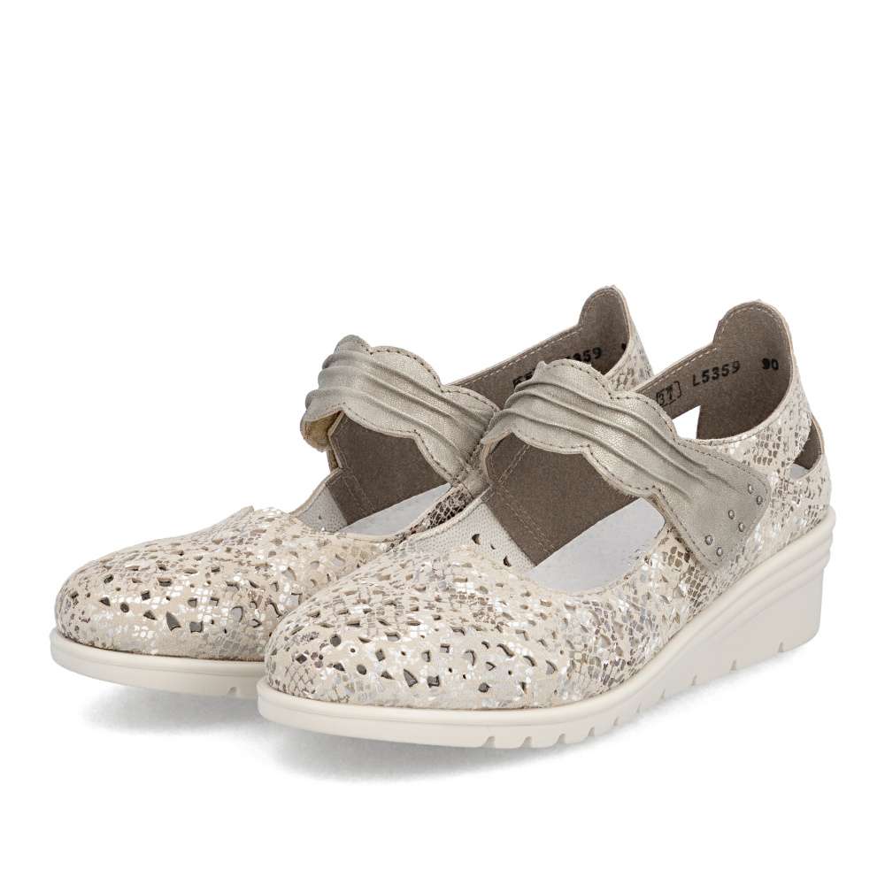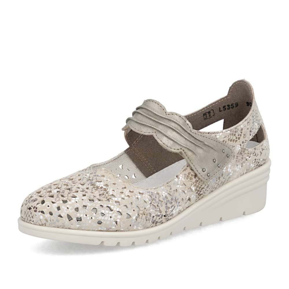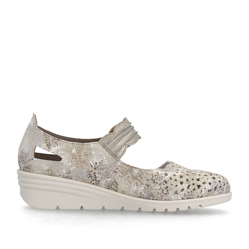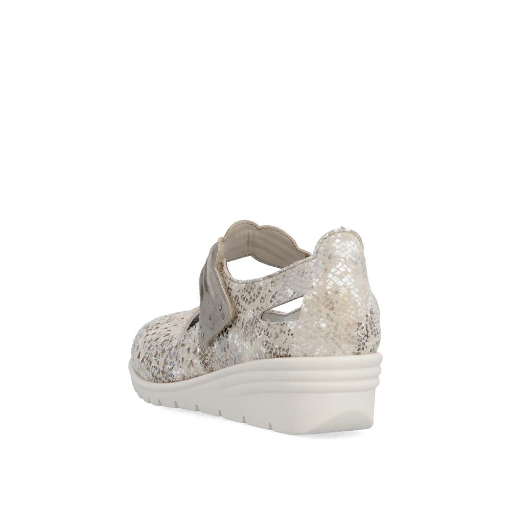 Těmto balerínám značky Rieker se jednoduše nedá odolat. Kožený svršek je posetý jemnou perforací a decentními odlesky potisku, které vytvářejí svěží vzhled. Pásek přes nárt v působivém provedení je opatřen suchým zipem, díky čemuž se baleríny snadno obouvají a dokonale přizpůsobí noze. Měkká kožená stélka zajistí příjemný pocit při každém kroku a nárazy tlumící podešev se postará o pohodlí během celého dne. Tyto baleríny nejsou jen obuví – jsou stylovým doplňkem, který podtrhne váš osobitý vkus a dodá každému outfitu noblesu a jemnou jiskru.