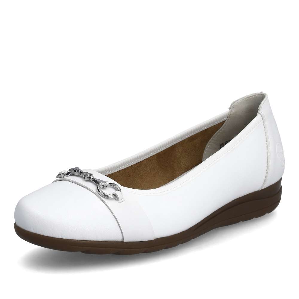Baleríny značky Rieker přinášejí jednoduchý a přesto půvabný ženský vzhled. Bílý svršek je zdoben aplikací na nártu stříbrné barvy, což přidává obuvi eleganci a výraz. Tato kombinace designových prvků vytváří atraktivní a ženský dojem. Měkká kožená stélka poskytuje maximální pohodlí při nošení, a flexibilní podešev zajišťuje snadný pohyb a pohodlí na každém kroku. Tyto baleríny jsou nejen stylové, ale také praktické pro každodenní nošení. Bílý svršek s aplikací poskytuje jemný dojem a boty budou vhodným obutím pro různé příležitosti. Technologie: Antistress – podešev je díky této technologii lehká, flexibilní, absorbuje nárazy při došlapu a snadno se přizpůsobí každé noze.