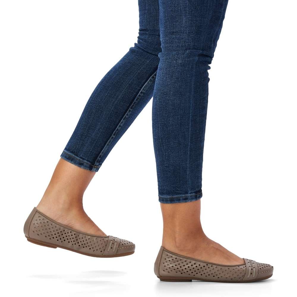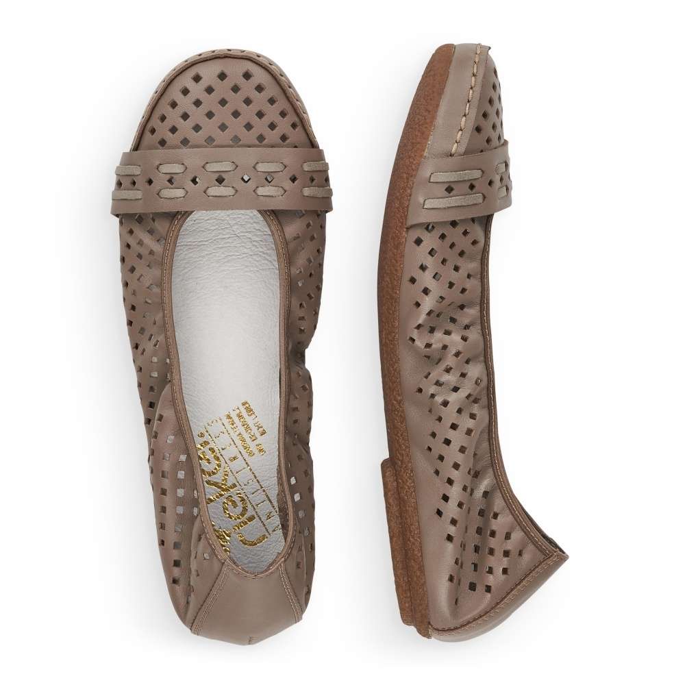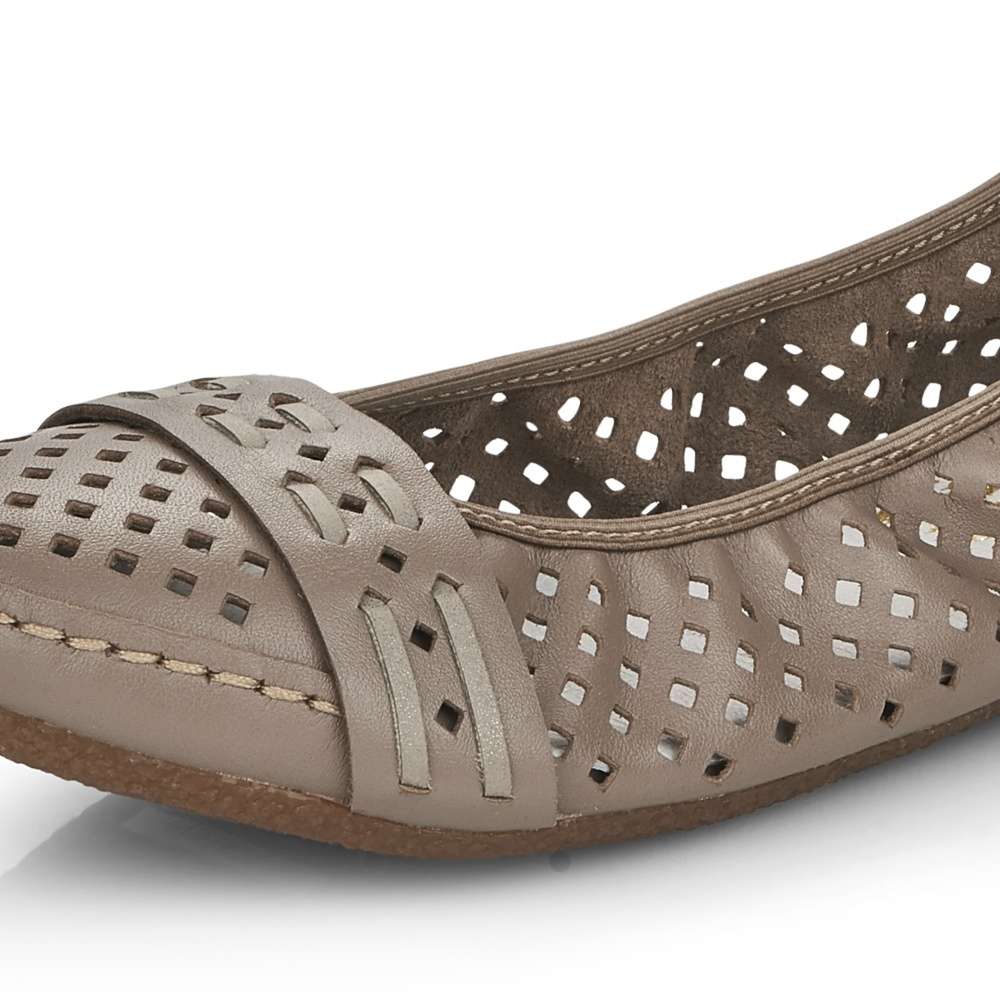 Dámské kožené baleríny značky RIEKER Vám nesmí chybět. Kožený svršek je zdoben designovou perforací, která zajistí prodyšnost obuvi. Pro dokonalé přizpůsobení obuvi dle Vašich potřeb poslouží všitá pružná gumička. Měkká stélka a pohodlná podešev zjistí maximální komfort při chůzi. S tímto kouskem skvěle doladíte Váš outfit v kombinaci se sukní či kalhotami.