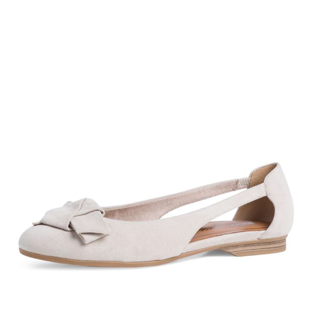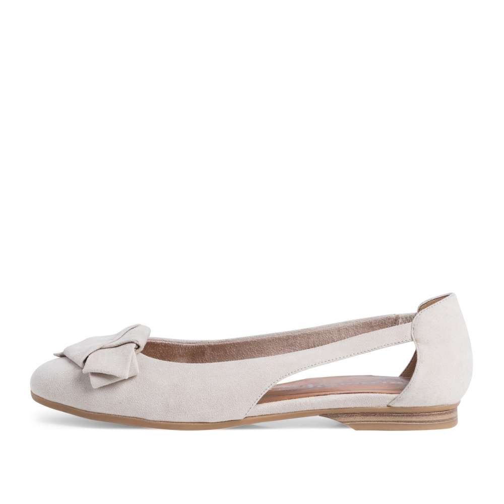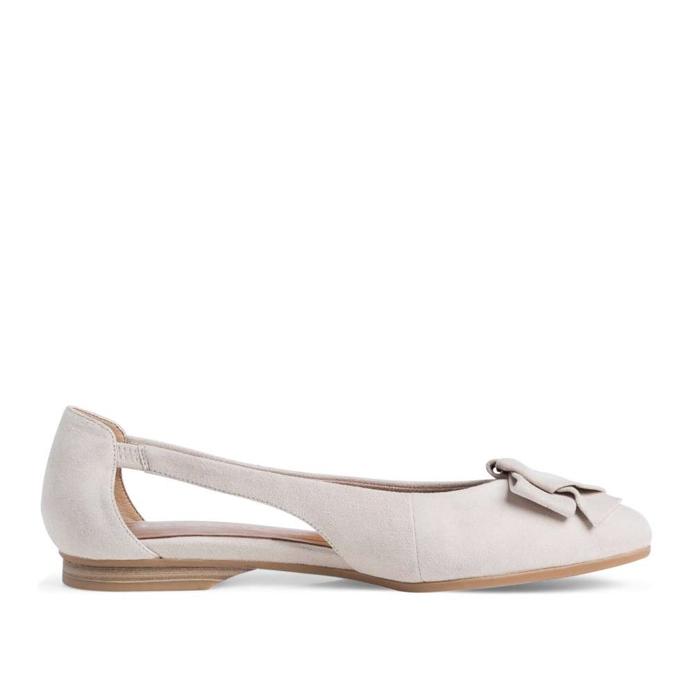 Nádherné dámské balerínky jsou zdobené mašlí na špici a designovými otvory po stranách. Mají kulatou špičku, kožený broušený srvšek a pružnou gumičku na vnější straně pro snadné obutí.