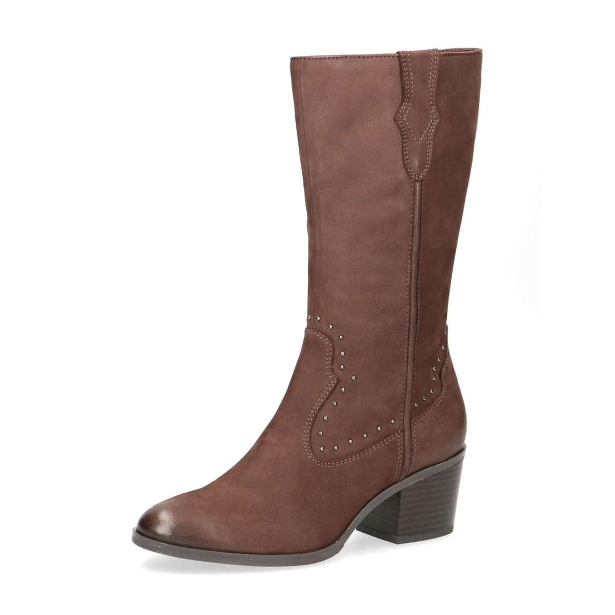 Polokozačky od značky CAPRICE se zdobnými cvočky a jemným prošitím jsou vyrobeny z pravé kůže v tmavě hnědém provedení. Pro snadnější obutí je zapracován zip na vnitřní straně a vsazená pružná gumička u horního okraje.