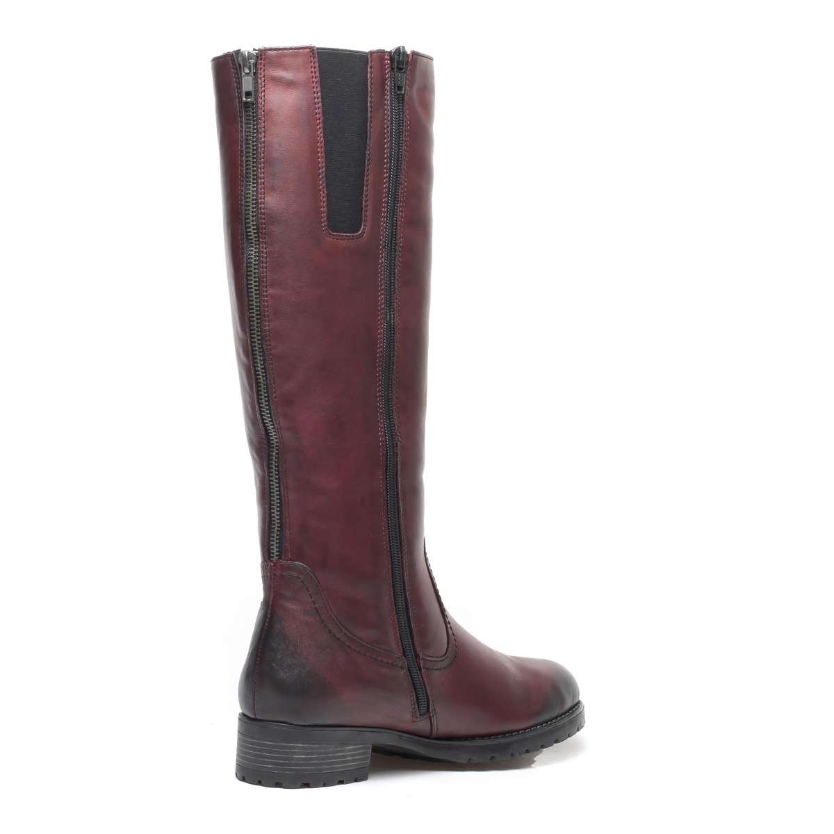 Tato dámská kozačka v tmavě červeném provedení zajisté osloví každou ženu, která má ráda jednoduchou krásu. Svršek z pravé kůže je hladký a zdoben pouze v oblasti nártu jemným prošíváním. Pro maximální komfort slouží funkční zip na vnitřní straně usnadňující nazouvání a zip v zadní části, který společně se všitou pružnou gumičkou umožní přizpůsobit si kozačku přímo na své lýtko.