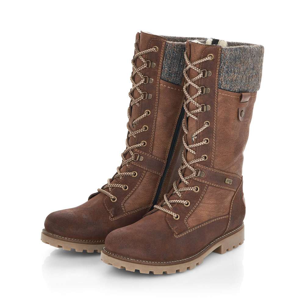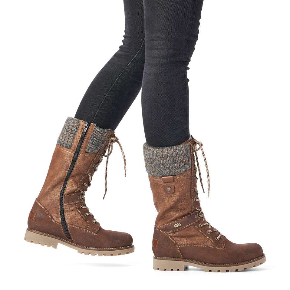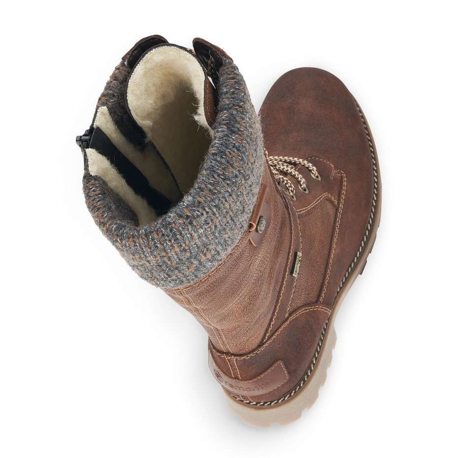 Dámské kožené polokozačky hnědé barvy pro zimní dny, značky REMONTE (jedná se o vyšší řadu značky RIEKER).