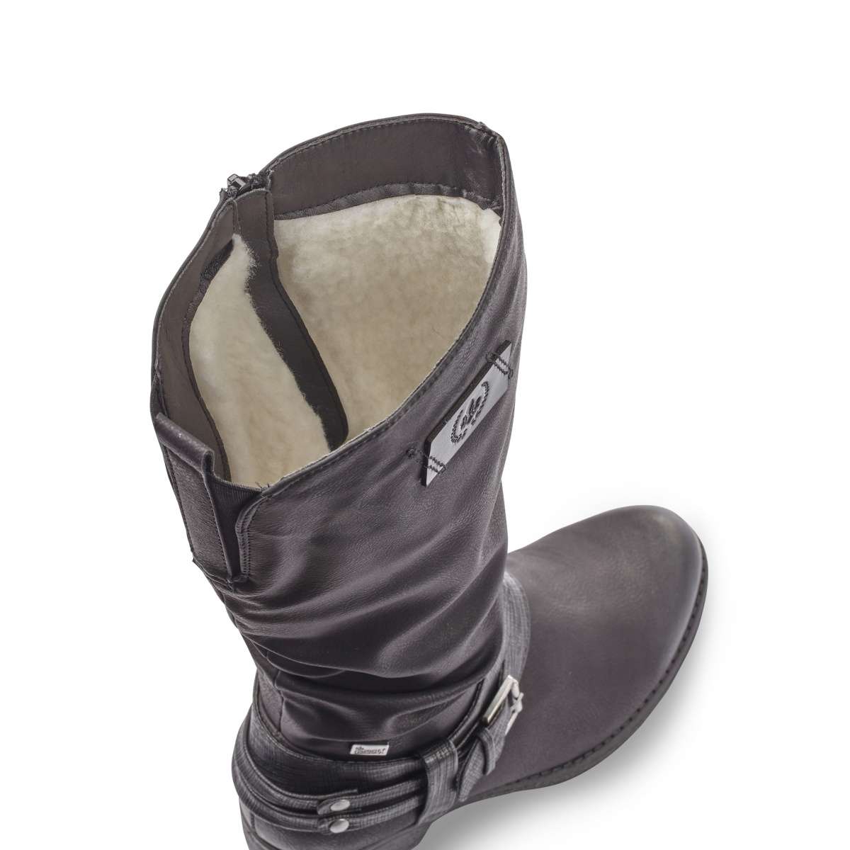 Tato dámská kozačka na nízkém podpatku v černé barvě krásně doplní jakýkoliv Váš ouffit. Zdobnými prvky jsou překřížené pásky se stříbrnou sponou v oblasti kotníku, ale také nařasení ve spodní části. Svršek je vybaven funkční vrstvou Rieker TEX, díky které je bota nepromokavá.