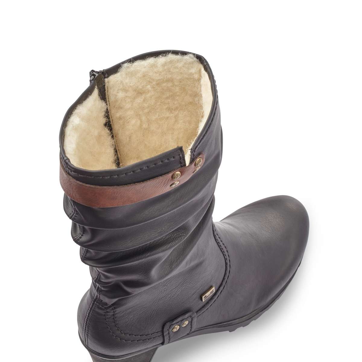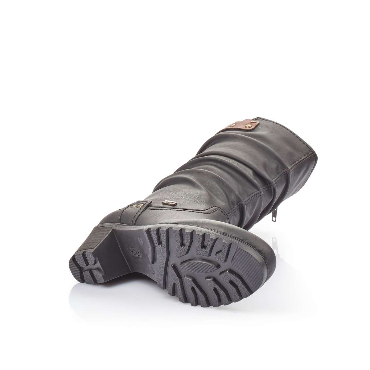 Dámská polokozačka v černé barvě je zdobená šitím a hnědým páskem kolem lýtka. Má kulatou špičku, dále funkce Antistress a RiekerTex, na vnitřní straně funkční zip pro snadné obutí. Teplou podšívku oceníte při procházkách zimní přírodou, ale i při chladných dnech při cestě do práce.