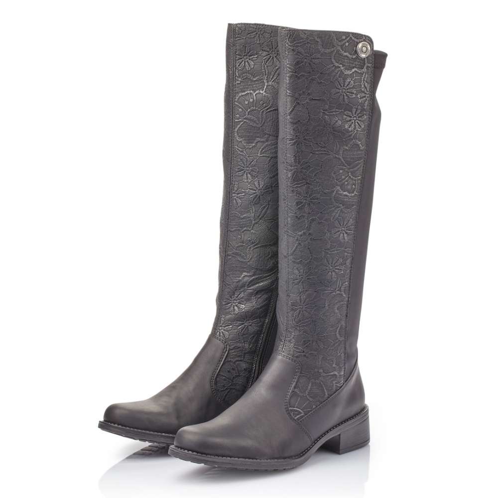 Dámské kozačky černé barvy na nízkém podpatku, značky RIEKER. Svršek Svršek černé barvy má ve spodní části hladký povrch, kulatou špičku, elegantní prošití černou nití v oblasti nártu a funkční zip na vnitřní straně. Zvláštní jsou pružným materiálem v zadní polovině svršku, který správně obejme Vaše lýtko a tím krásně sedí na noze - Vario. Ale také v přední části svršku květovaným vzorem, pro unikátní vzhled kozačky. Stélka Extra měkká textilní stélka Vám dodá pocit pohodlí při každém kroku. Podešev Podešev s jemným vzorkem je vyrobena z velmi kvalitního syntetického materiálu a speciální je použitou technologií Antistress, díky které je obuv lehká, flexibilní a umožňuje Vám dostatečný vnitřní prostor. Tento model musí mít doma každá žena. Jsou velmi dobře kombinovatelné se všemi outfity. Technologie: Antistress: Ano Vario: Ano OBVOD KOZAČEK V HORNÍ ČÁSTI BOTY Velikost 37: cca 35 cm + cca 6 cm díky sytému Vario Velikost 38: cca 36 cm + cca 6 cm díky sytému Vario Velikost 39: cca 37 cm + cca 6 cm díky sytému Vario Velikost 40: cca 38 cm + cca 6 cm díky sytému Vario Velikost 41: cca 39 cm + cca 6 cm díky sytému Vario Velikost 42: cca 40 cm + cca 6 cm díky sytému Vario
