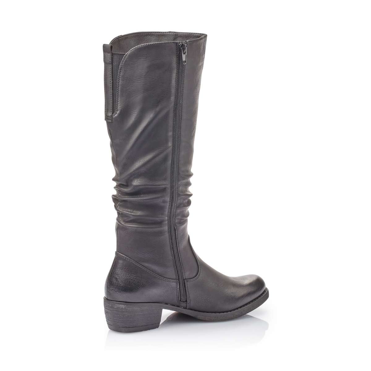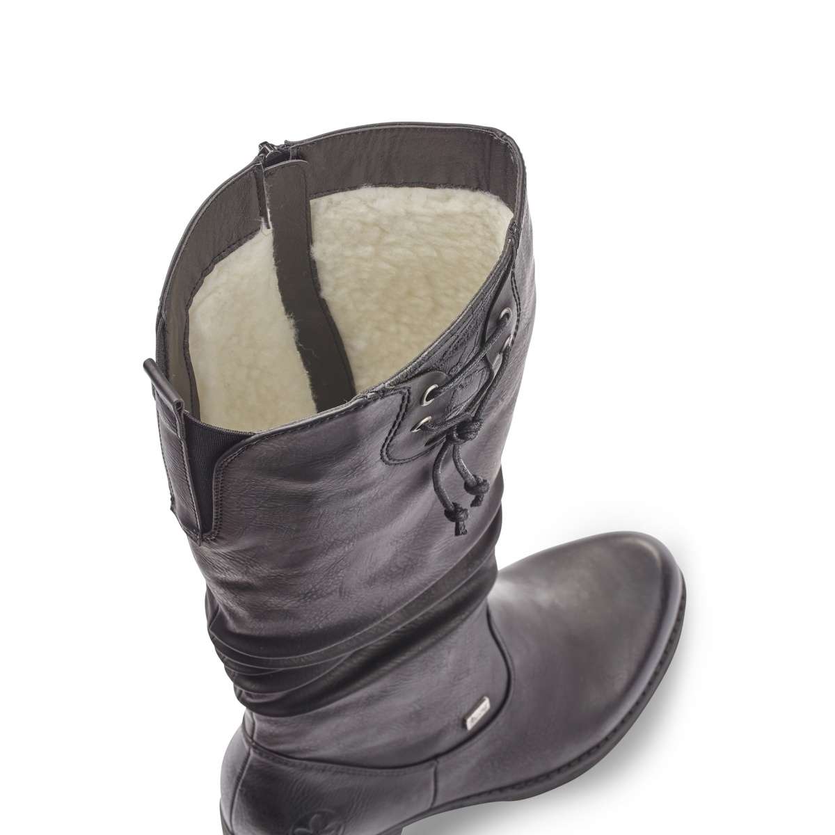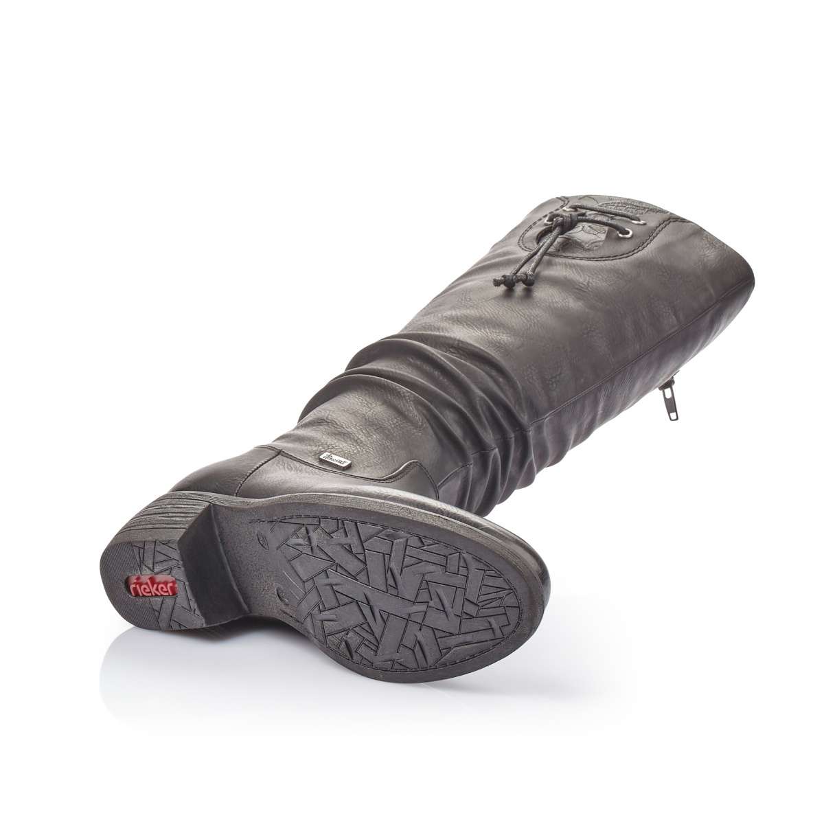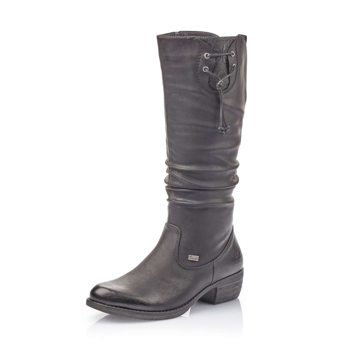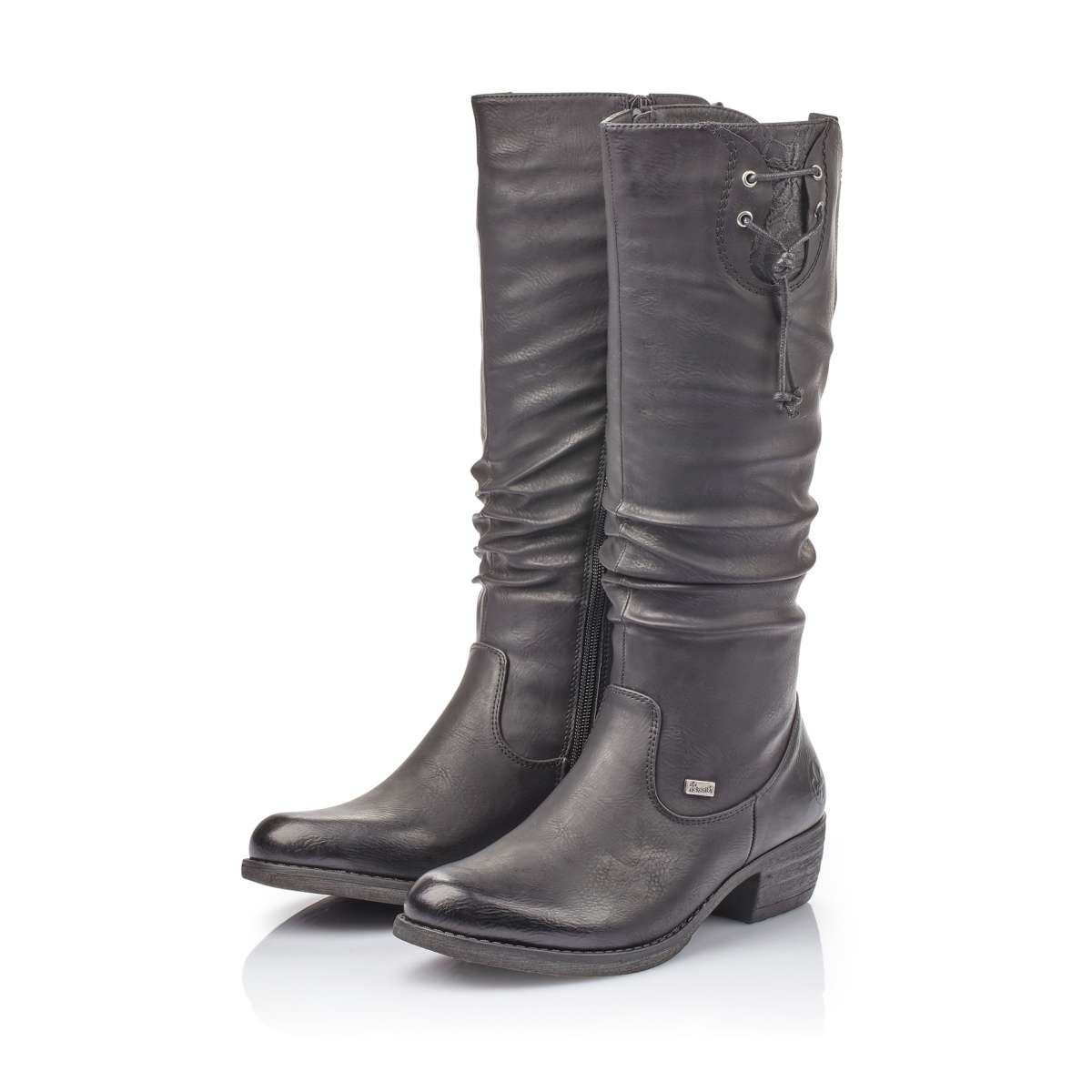 Dámská kozačka v černé barvě se zdobnými šňůrkami, značky RIEKER.
