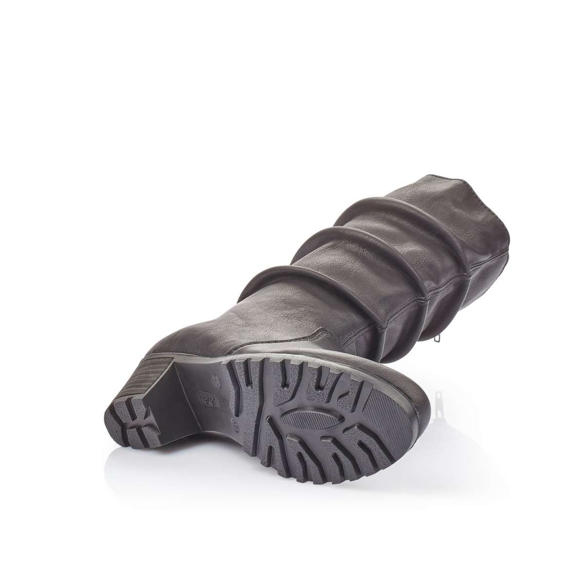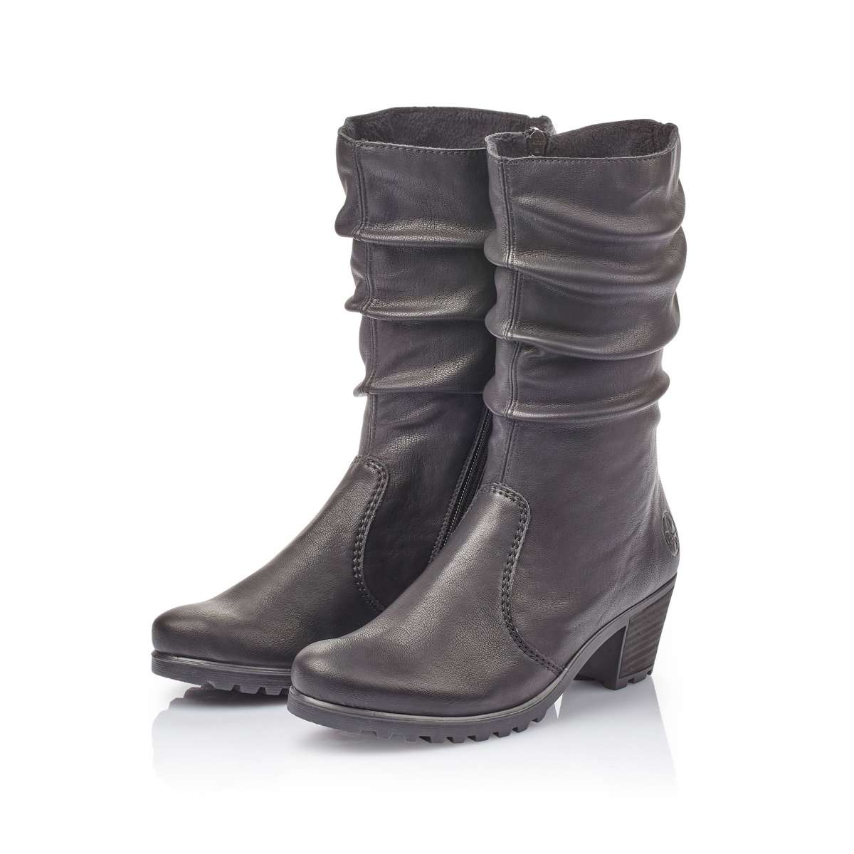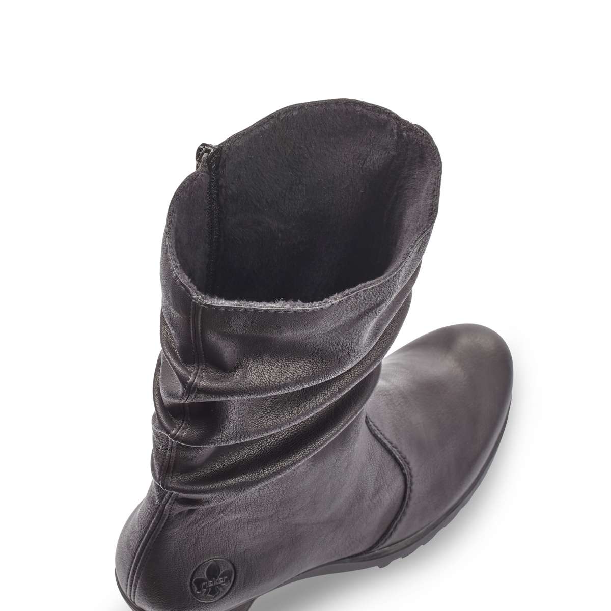 Dámská polokozačka značky RIEKER v elegantní černé barvě s jemným pokrčením v horní části boty, kterou doplňuje decentní logo značky. Má kulatou špičku a na vnitřní straně funkční zip pro snadné obutí. Tento model bude tou správnou volbou pro každou moderní ženu.